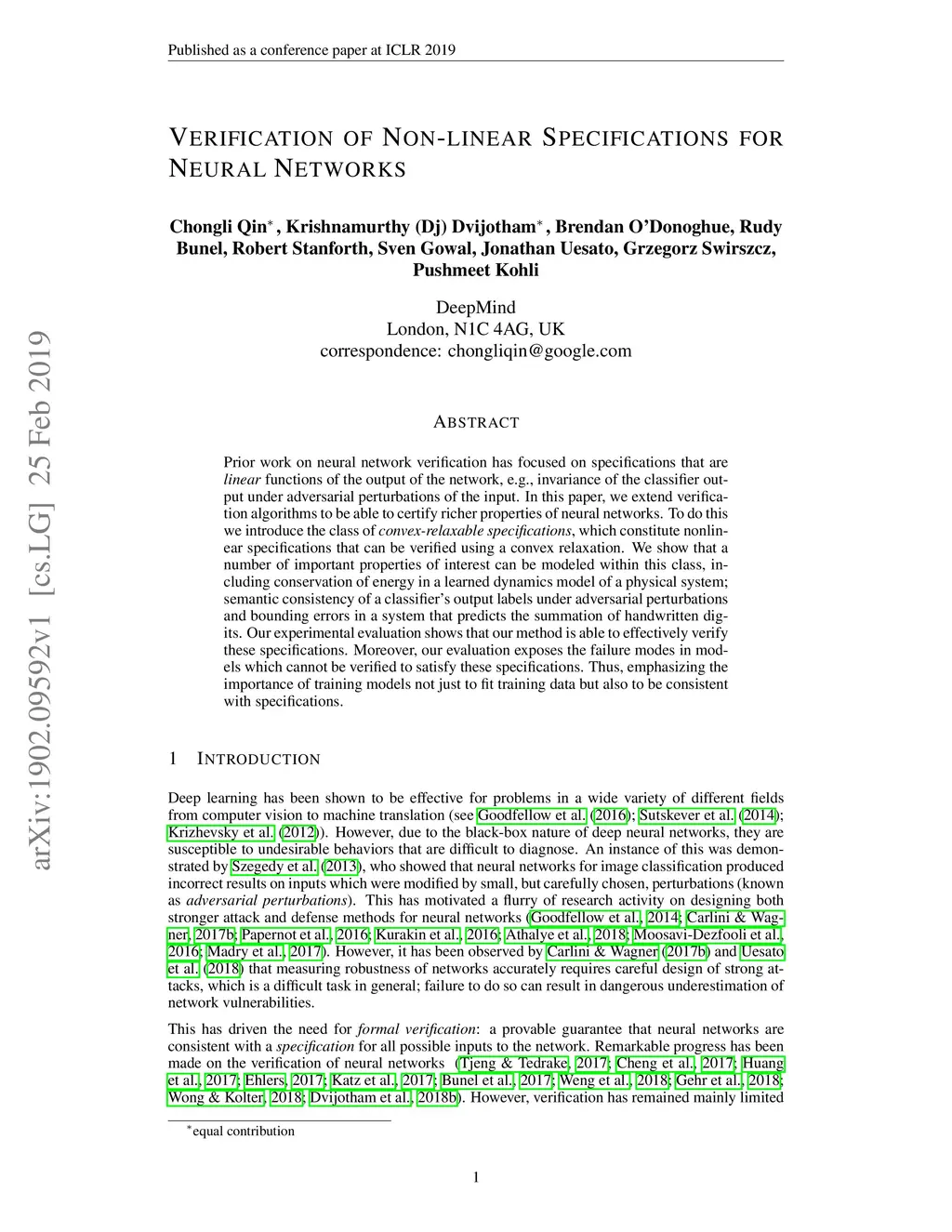 Prior work on neural network verification has focused on specifications that are linear functions of the output of the network, e.g., invariance of the classifier output under adversarial perturbations of the input. In this paper, we extend verification algorithms to be able to certify richer properties of neural networks. To do this we introduce the class of convex-relaxable specifications, which constitute nonlinear specifications that can be verified using a convex relaxation. We show that a number of important properties of interest can be modeled within this class, including conservation of energy in a learned dynamics model of a physical system; semantic consistency of a classifier's output labels under adversarial perturbations and bounding errors in a system that predicts the summation of handwritten digits. Our experimental evaluation shows that our method is able to effectively verify these specifications. Moreover, our evaluation exposes the failure modes in models which cannot be verified to satisfy these specifications. Thus, emphasizing the importance of training models not just to fit training data but also to be consistent with specifications.