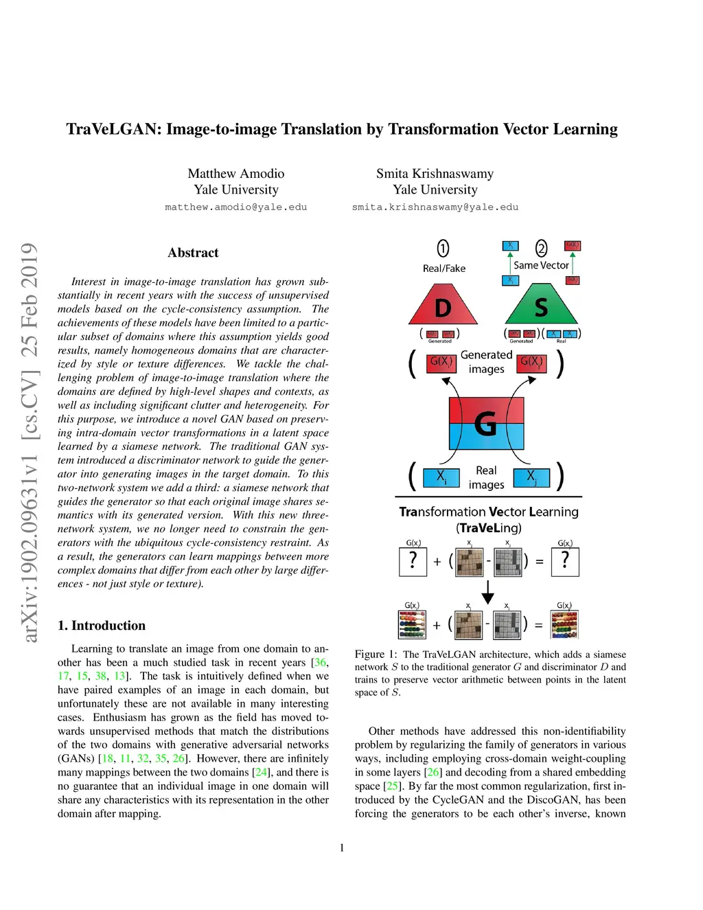 Interest in image-to-image translation has grown substantially in recent years with the success of unsupervised models based on the cycle-consistency assumption. The achievements of these models have been limited to a particular subset of domains where this assumption yields good results, namely homogeneous domains that are characterized by style or texture differences. We tackle the challenging problem of image-to-image translation where the domains are defined by high-level shapes and contexts, as well as including significant clutter and heterogeneity. For this purpose, we introduce a novel GAN based on preserving intra-domain vector transformations in a latent space learned by a siamese network. The traditional GAN system introduced a discriminator network to guide the generator into generating images in the target domain. To this two-network system we add a third: a siamese network that guides the generator so that each original image shares semantics with its generated version. With this new three-network system, we no longer need to constrain the generators with the ubiquitous cycle-consistency restraint. As a result, the generators can learn mappings between more complex domains that differ from each other by large differences - not just style or texture.