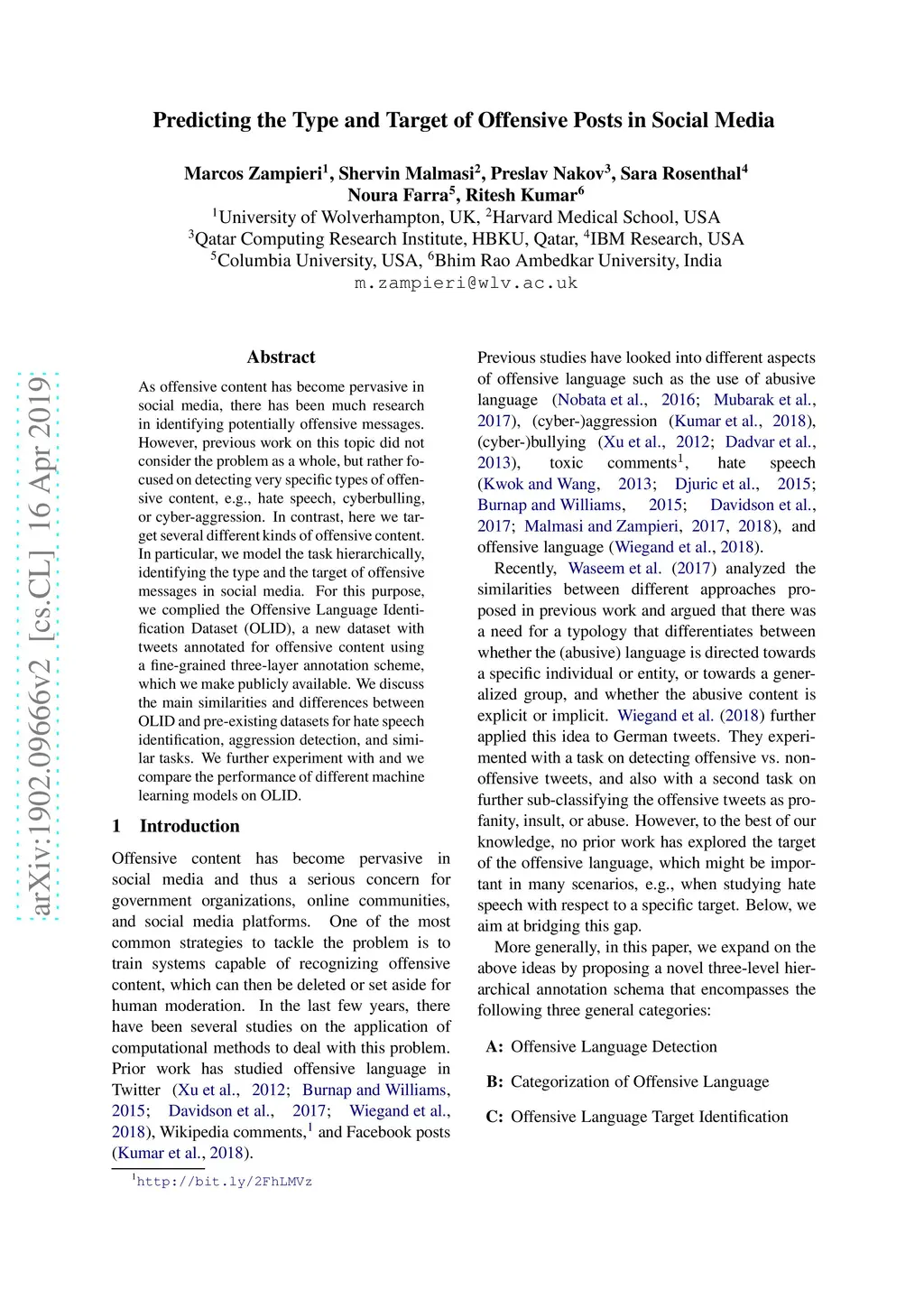 As offensive content has become pervasive in social media, there has been much research in identifying potentially offensive messages. However, previous work on this topic did not consider the problem as a whole, but rather focused on detecting very specific types of offensive content, e.g., hate speech, cyberbulling, or cyber-aggression. In contrast, here we target several different kinds of offensive content. In particular, we model the task hierarchically, identifying the type and the target of offensive messages in social media. For this purpose, we complied the Offensive Language Identification Dataset (OLID), a new dataset with tweets annotated for offensive content using a fine-grained three-layer annotation scheme, which we make publicly available. We discuss the main similarities and differences between OLID and pre-existing datasets for hate speech identification, aggression detection, and similar tasks. We further experiment with and we compare the performance of different machine learning models on OLID.