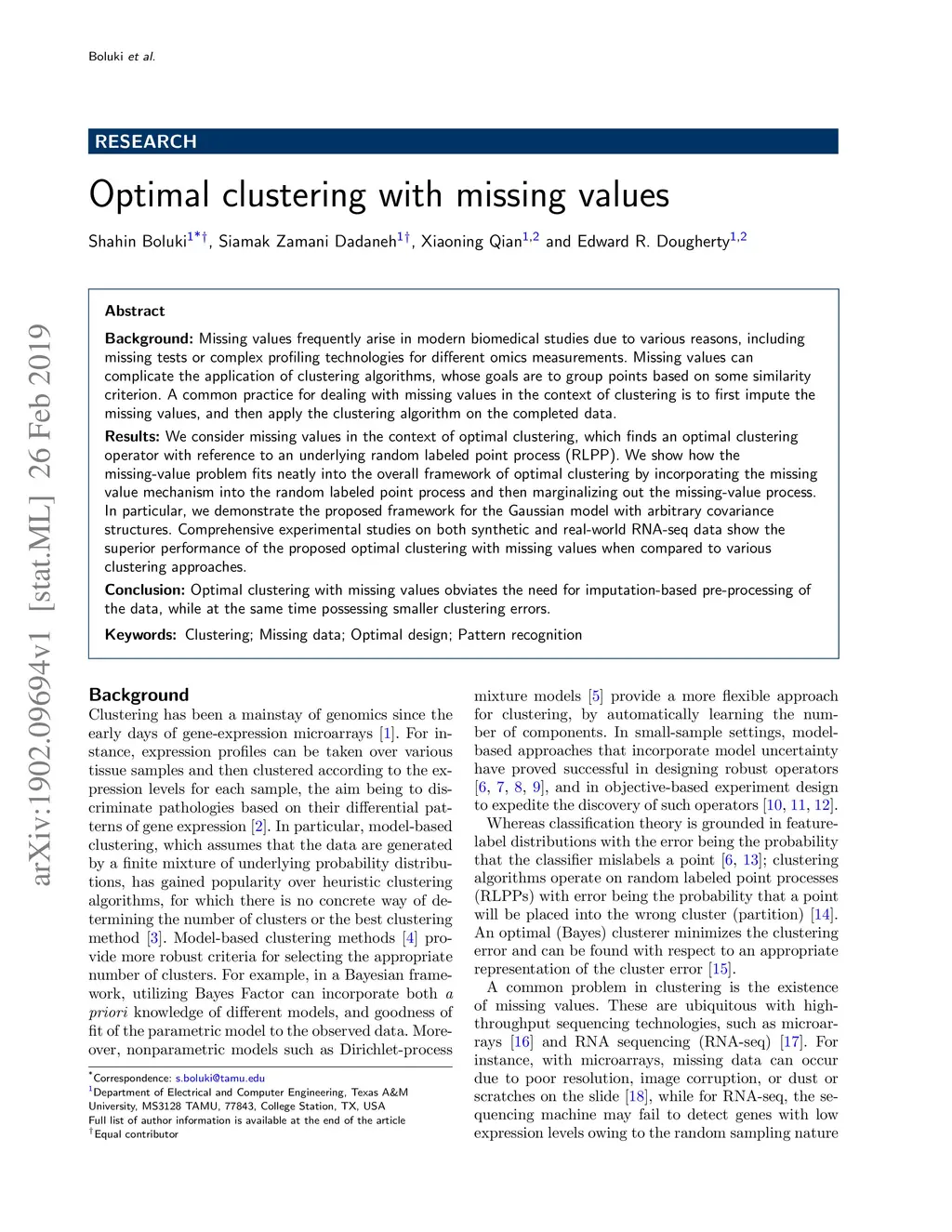 Missing values frequently arise in modern biomedical studies due to various reasons, including missing tests or complex profiling technologies for different omics measurements. Missing values can complicate the application of clustering algorithms, whose goals are to group points based on some similarity criterion. A common practice for dealing with missing values in the context of clustering is to first impute the missing values, and then apply the clustering algorithm on the completed data. We consider missing values in the context of optimal clustering, which finds an optimal clustering operator with reference to an underlying random labeled point process (RLPP). We show how the missing-value problem fits neatly into the overall framework of optimal clustering by incorporating the missing value mechanism into the random labeled point process and then marginalizing out the missing-value process. In particular, we demonstrate the proposed framework for the Gaussian model with arbitrary covariance structures. Comprehensive experimental studies on both synthetic and real-world RNA-seq data show the superior performance of the proposed optimal clustering with missing values when compared to various clustering approaches. Optimal clustering with missing values obviates the need for imputation-based pre-processing of the data, while at the same time possessing smaller clustering errors.
