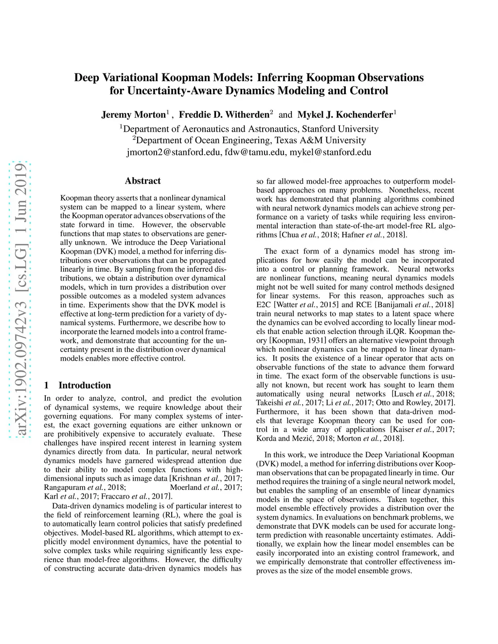 Koopman theory asserts that a nonlinear dynamical system can be mapped to a linear system, where the Koopman operator advances observations of the state forward in time. However, the observable functions that map states to observations are generally unknown. We introduce the Deep Variational Koopman (DVK) model, a method for inferring distributions over observations that can be propagated linearly in time. By sampling from the inferred distributions, we obtain a distribution over dynamical models, which in turn provides a distribution over possible outcomes as a modeled system advances in time. Experiments show that the DVK model is effective at long-term prediction for a variety of dynamical systems. Furthermore, we describe how to incorporate the learned models into a control framework, and demonstrate that accounting for the uncertainty present in the distribution over dynamical models enables more effective control.