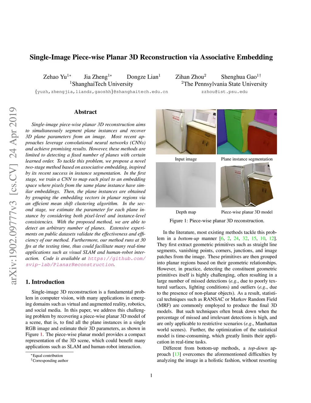 Single-Image Piece-wise Planar 3D Reconstruction via Associative