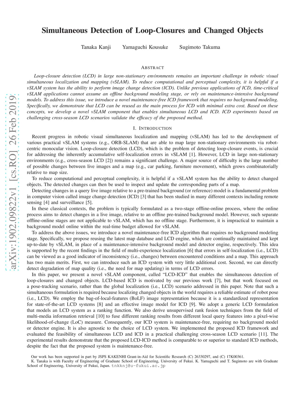 Loop-closure detection (LCD) in large non-stationary environments remains an important challenge in robotic visual simultaneous localization and mapping (vSLAM). To reduce computational and perceptual complexity, it is helpful if a vSLAM system has the ability to perform image change detection (ICD). Unlike previous applications of ICD, time-critical vSLAM applications cannot assume an offline background modeling stage, or rely on maintenance-intensive background models. To address this issue, we introduce a novel maintenance-free ICD framework that requires no background modeling. Specifically, we demonstrate that LCD can be reused as the main process for ICD with minimal extra cost. Based on these concepts, we develop a novel vSLAM component that enables simultaneous LCD and ICD. ICD experiments based on challenging cross-season LCD scenarios validate the efficacy of the proposed method.