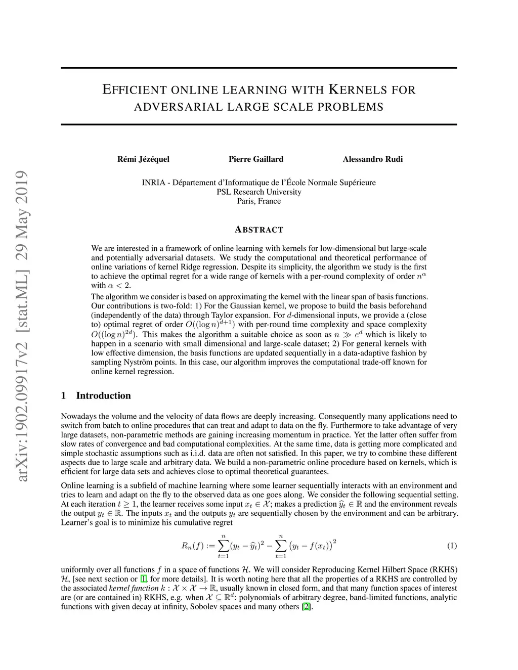 We are interested in a framework of online learning with kernels for low-dimensional but large-scale and potentially adversarial datasets. We study the computational and theoretical performance of online variations of kernel Ridge regression. Despite its simplicity, the algorithm we study is the first to achieve the optimal regret for a wide range of kernels with a per-round complexity of order with . The algorithm we consider is based on approximating the kernel with the linear span of basis functions. Our contributions is two-fold: 1) For the Gaussian kernel, we propose to build the basis beforehand (independently of the data) through Taylor expansion. For -dimensional inputs, we provide a (close to) optimal regret of order with per-round time complexity and space complexity . This makes the algorithm a suitable choice as soon as which is likely to happen in a scenario with small dimensional and large-scale dataset; 2) For general kernels with low effective dimension, the basis functions are updated sequentially in a data-adaptive fashion by sampling Nystr{\"o}m points. In this case, our algorithm improves the computational trade-off known for online kernel regression.