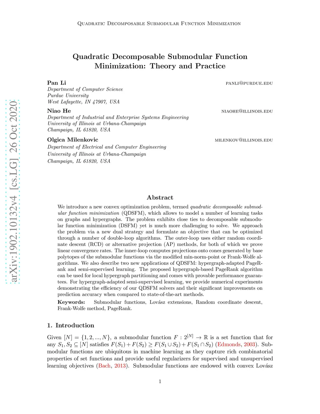 We introduce a new convex optimization problem, termed quadratic decomposable submodular function minimization (QDSFM), which allows to model a number of learning tasks on graphs and hypergraphs. The problem exhibits close ties to decomposable submodular function minimization (DSFM), yet is much more challenging to solve. We approach the problem via a new dual strategy and formulate an objective that can be optimized through a number of double-loop algorithms. The outer-loop uses either random coordinate descent (RCD) or alternative projection (AP) methods, for both of which we prove linear convergence rates. The inner-loop computes projections onto cones generated by base polytopes of the submodular functions, via the modified min-norm-point or Frank-Wolfe algorithm. We also describe two new applications of QDSFM: hypergraph-adapted PageRank and semi-supervised learning. The proposed hypergraph-based PageRank algorithm can be used for local hypergraph partitioning, and comes with provable performance guarantees. For hypergraph-adapted semi-supervised learning, we provide numerical experiments demonstrating the efficiency of our QDSFM solvers and their significant improvements on prediction accuracy when compared to state-of-the-art methods.