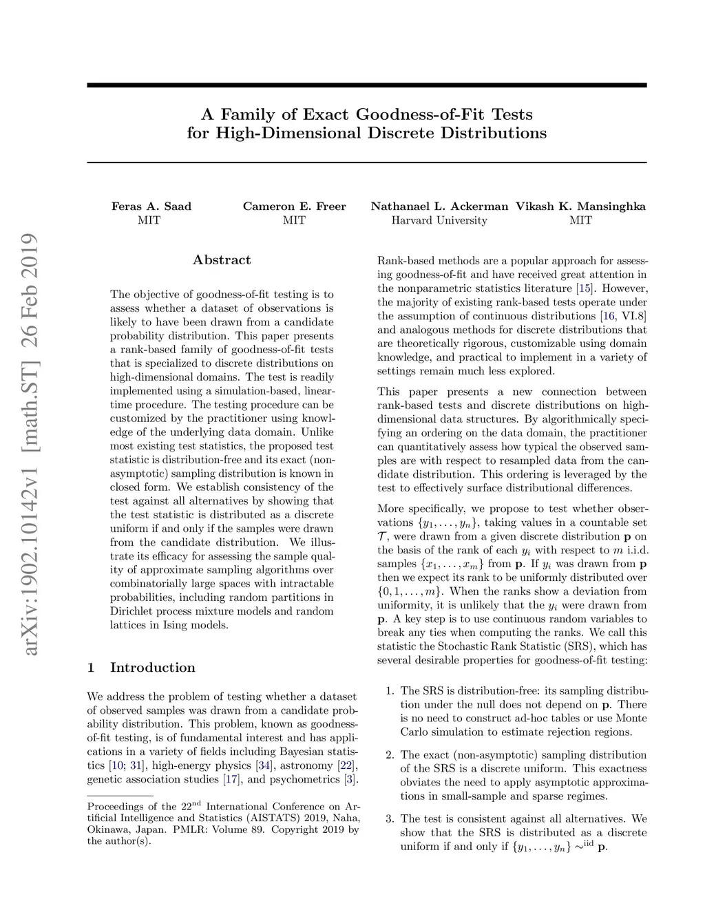 The objective of goodness-of-fit testing is to assess whether a dataset of observations is likely to have been drawn from a candidate probability distribution. This paper presents a rank-based family of goodness-of-fit tests that is specialized to discrete distributions on high-dimensional domains. The test is readily implemented using a simulation-based, linear-time procedure. The testing procedure can be customized by the practitioner using knowledge of the underlying data domain. Unlike most existing test statistics, the proposed test statistic is distribution-free and its exact (non-asymptotic) sampling distribution is known in closed form. We establish consistency of the test against all alternatives by showing that the test statistic is distributed as a discrete uniform if and only if the samples were drawn from the candidate distribution. We illustrate its efficacy for assessing the sample quality of approximate sampling algorithms over combinatorially large spaces with intractable probabilities, including random partitions in Dirichlet process mixture models and random lattices in Ising models.