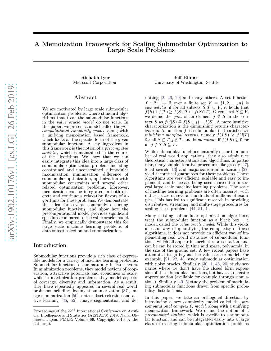 We are motivated by large scale submodular optimization problems, where standard algorithms that treat the submodular functions in the \emph{value oracle model} do not scale. In this paper, we present a model called the \emph{precomputational complexity model}, along with a unifying memoization based framework, which looks at the specific form of the given submodular function. A key ingredient in this framework is the notion of a \emph{precomputed statistic}, which is maintained in the course of the algorithms. We show that we can easily integrate this idea into a large class of submodular optimization problems including constrained and unconstrained submodular maximization, minimization, difference of submodular optimization, optimization with submodular constraints and several other related optimization problems. Moreover, memoization can be integrated in both discrete and continuous relaxation flavors of algorithms for these problems. We demonstrate this idea for several commonly occurring submodular functions, and show how the precomputational model provides significant speedups compared to the value oracle model. Finally, we empirically demonstrate this for large scale machine learning problems of data subset selection and summarization.