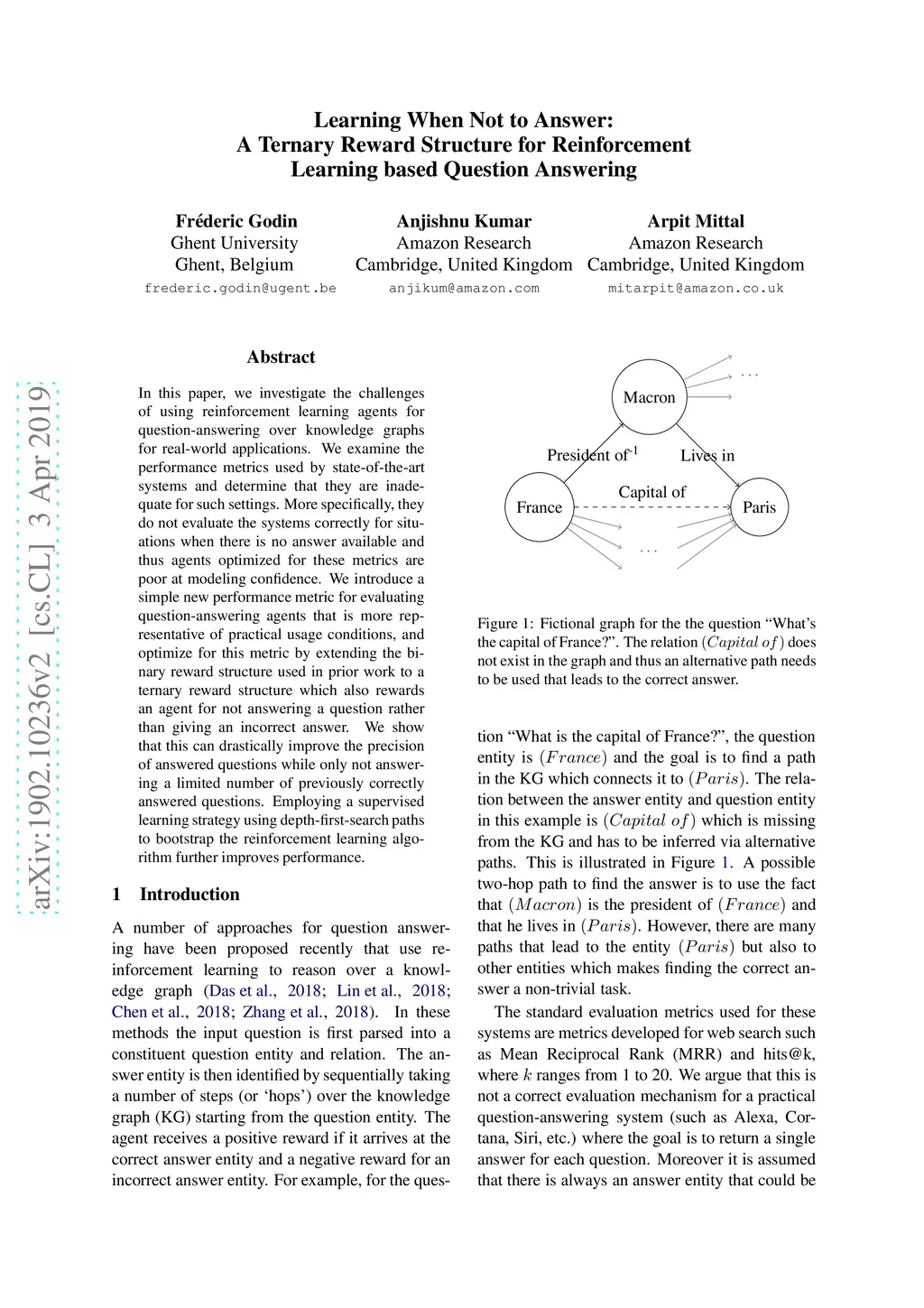 In this paper, we investigate the challenges of using reinforcement learning agents for question-answering over knowledge graphs for real-world applications. We examine the performance metrics used by state-of-the-art systems and determine that they are inadequate for such settings. More specifically, they do not evaluate the systems correctly for situations when there is no answer available and thus agents optimized for these metrics are poor at modeling confidence. We introduce a simple new performance metric for evaluating question-answering agents that is more representative of practical usage conditions, and optimize for this metric by extending the binary reward structure used in prior work to a ternary reward structure which also rewards an agent for not answering a question rather than giving an incorrect answer. We show that this can drastically improve the precision of answered questions while only not answering a limited number of previously correctly answered questions. Employing a supervised learning strategy using depth-first-search paths to bootstrap the reinforcement learning algorithm further improves performance.