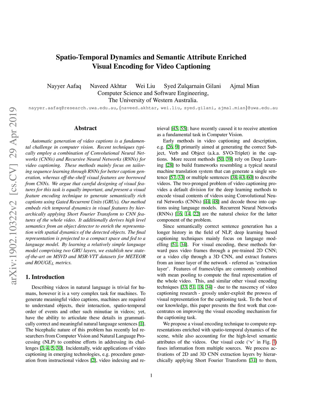 Automatic generation of video captions is a fundamental challenge in computer vision. Recent techniques typically employ a combination of Convolutional Neural Networks (CNNs) and Recursive Neural Networks (RNNs) for video captioning. These methods mainly focus on tailoring sequence learning through RNNs for better caption generation, whereas off-the-shelf visual features are borrowed from CNNs. We argue that careful designing of visual features for this task is equally important, and present a visual feature encoding technique to generate semantically rich captions using Gated Recurrent Units (GRUs). Our method embeds rich temporal dynamics in visual features by hierarchically applying Short Fourier Transform to CNN features of the whole video. It additionally derives high level semantics from an object detector to enrich the representation with spatial dynamics of the detected objects. The final representation is projected to a compact space and fed to a language model. By learning a relatively simple language model comprising two GRU layers, we establish new state-of-the-art on MSVD and MSR-VTT datasets for METEOR and ROUGE_L metrics.
