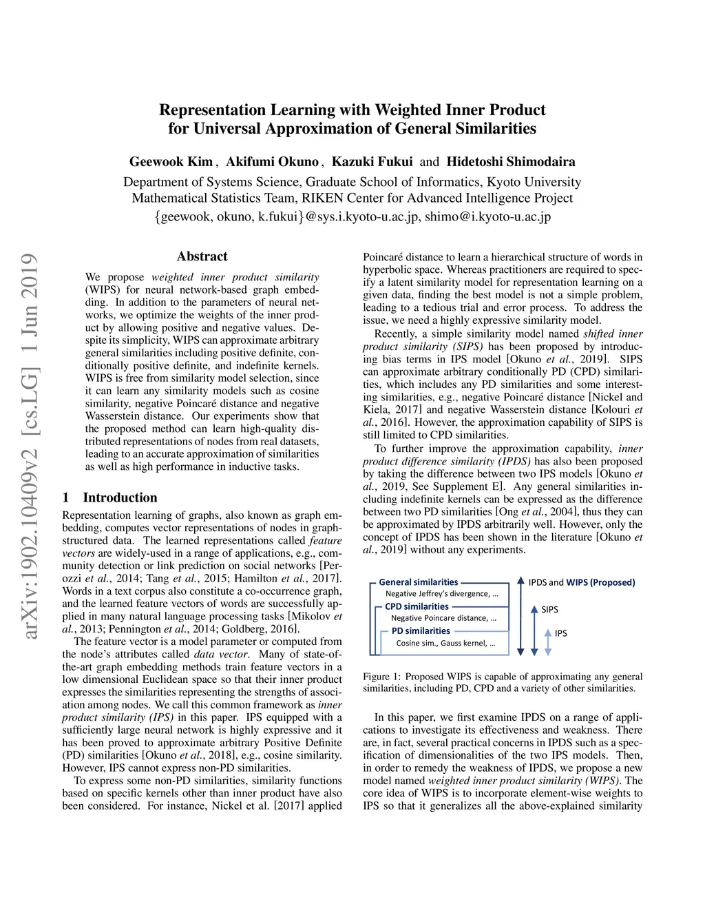 We propose (WIPS) for neural network-based graph embedding. In addition to the parameters of neural networks, we optimize the weights of the inner product by allowing positive and negative values. Despite its simplicity, WIPS can approximate arbitrary general similarities including positive definite, conditionally positive definite, and indefinite kernels. WIPS is free from similarity model selection, since it can learn any similarity models such as cosine similarity, negative Poincar\é distance and negative Wasserstein distance. Our experiments show that the proposed method can learn high-quality distributed representations of nodes from real datasets, leading to an accurate approximation of similarities as well as high performance in inductive tasks.