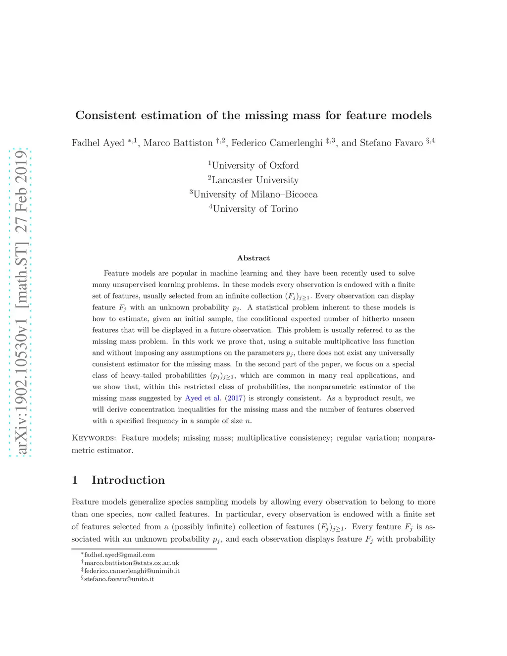 Feature models are popular in machine learning and they have been recently used to solve many unsupervised learning problems. In these models every observation is endowed with a finite set of features, usually selected from an infinite collection . Every observation can display feature with an unknown probability . A statistical problem inherent to these models is how to estimate, given an initial sample, the conditional expected number of hitherto unseen features that will be displayed in a future observation. This problem is usually referred to as the missing mass problem. In this work we prove that, using a suitable multiplicative loss function and without imposing any assumptions on the parameters , there does not exist any universally consistent estimator for the missing mass. In the second part of the paper, we focus on a special class of heavy-tailed probabilities , which are common in many real applications, and we show that, within this restricted class of probabilities, the nonparametric estimator of the missing mass suggested by Ayed et al. (2017) is strongly consistent. As a byproduct result, we will derive concentration inequalities for the missing mass and the number of features observed with a specified frequency in a sample of size .