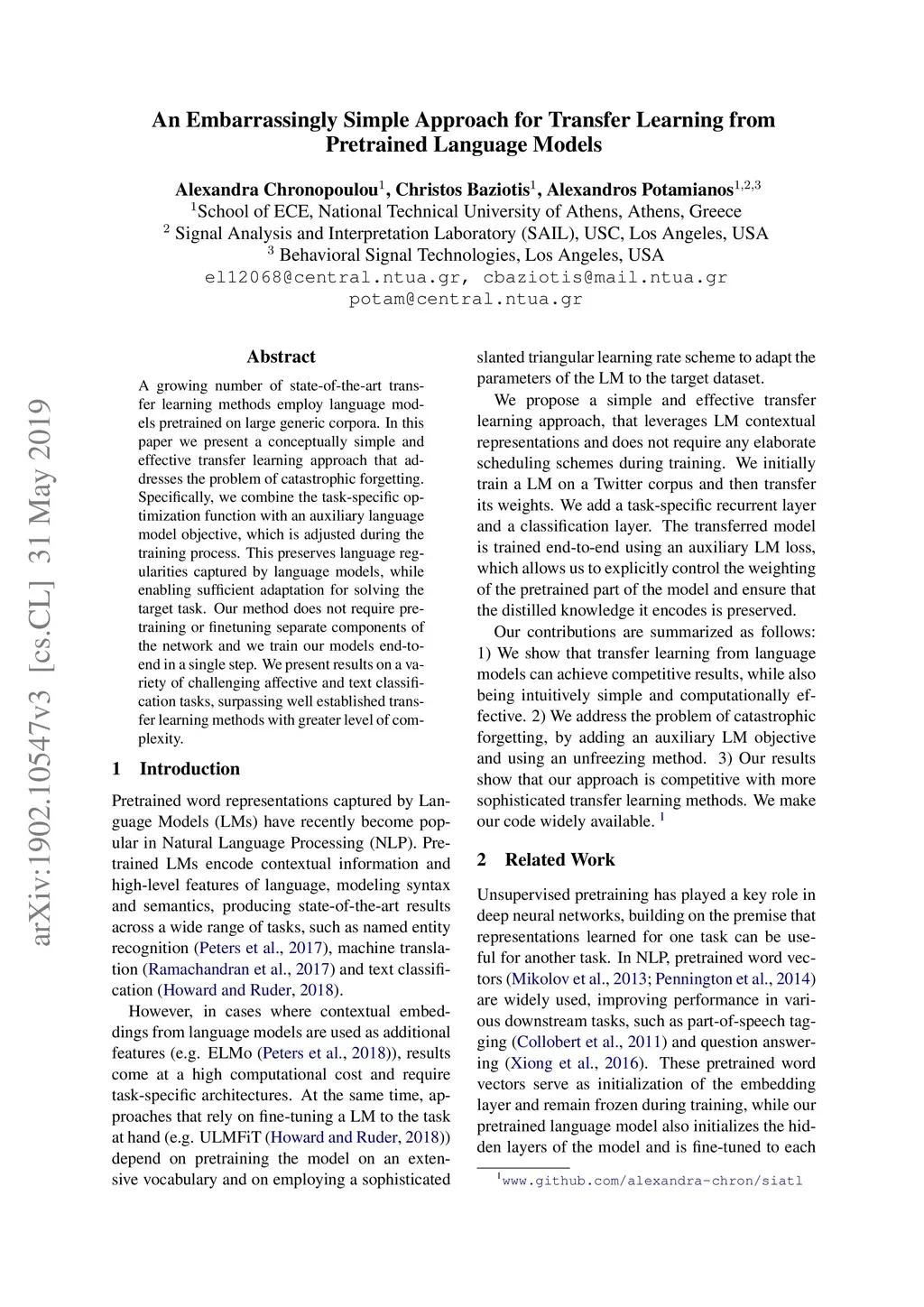 A growing number of state-of-the-art transfer learning methods employ language models pretrained on large generic corpora. In this paper we present a conceptually simple and effective transfer learning approach that addresses the problem of catastrophic forgetting. Specifically, we combine the task-specific optimization function with an auxiliary language model objective, which is adjusted during the training process. This preserves language regularities captured by language models, while enabling sufficient adaptation for solving the target task. Our method does not require pretraining or finetuning separate components of the network and we train our models end-to-end in a single step. We present results on a variety of challenging affective and text classification tasks, surpassing well established transfer learning methods with greater level of complexity.