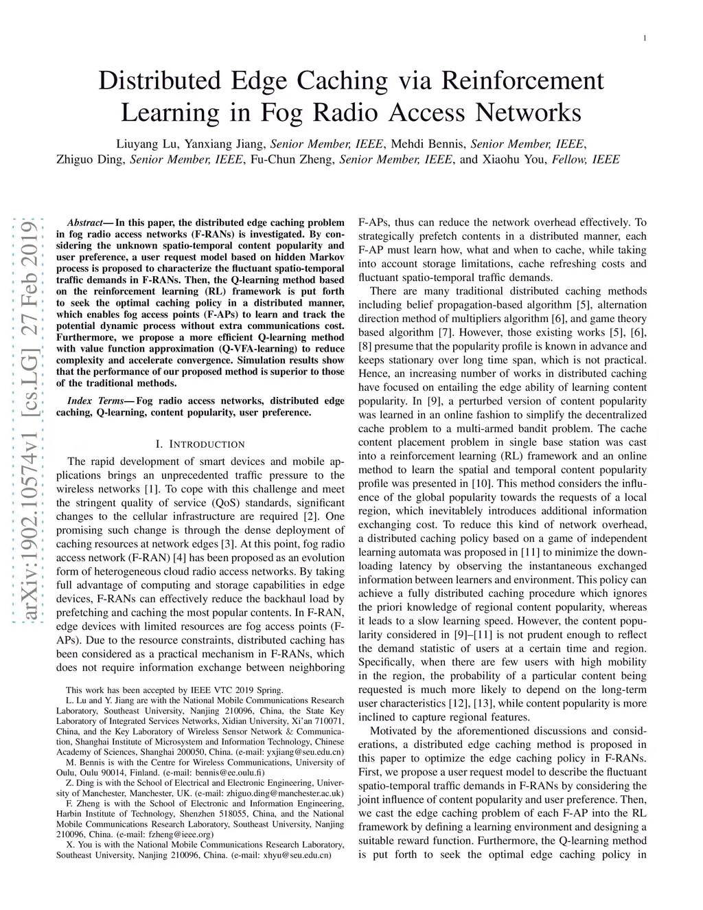 Distributed Edge Caching via Reinforcement Learning in Fog Radio Access
