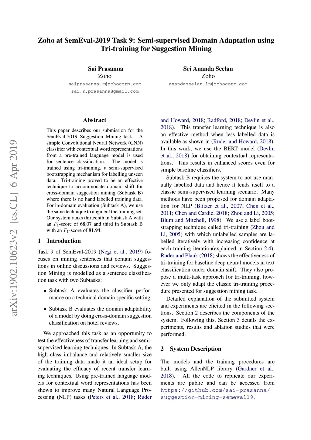 Zoho at SemEval-2019 Task 9: Semi-supervised Domain Adaptation using