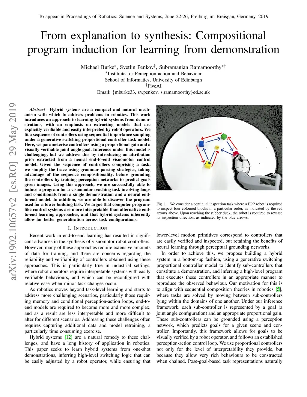 Hybrid systems are a compact and natural mechanism with which to address problems in robotics. This work introduces an approach to learning hybrid systems from demonstrations, with an emphasis on extracting models that are explicitly verifiable and easily interpreted by robot operators. We fit a sequence of controllers using sequential importance sampling under a generative switching proportional controller task model. Here, we parameterise controllers using a proportional gain and a visually verifiable joint angle goal. Inference under this model is challenging, but we address this by introducing an attribution prior extracted from a neural end-to-end visuomotor control model. Given the sequence of controllers comprising a task, we simplify the trace using grammar parsing strategies, taking advantage of the sequence compositionality, before grounding the controllers by training perception networks to predict goals given images. Using this approach, we are successfully able to induce a program for a visuomotor reaching task involving loops and conditionals from a single demonstration and a neural end-to-end model. In addition, we are able to discover the program used for a tower building task. We argue that computer program-like control systems are more interpretable than alternative end-to-end learning approaches, and that hybrid systems inherently allow for better generalisation across task configurations.