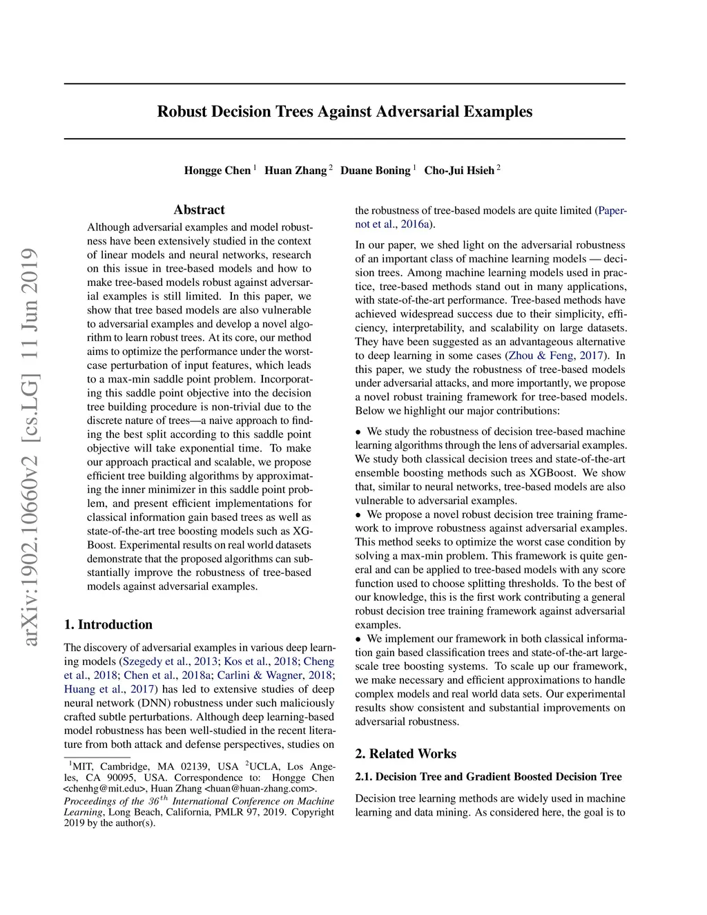 Although adversarial examples and model robustness have been extensively studied in the context of linear models and neural networks, research on this issue in tree-based models and how to make tree-based models robust against adversarial examples is still limited. In this paper, we show that tree based models are also vulnerable to adversarial examples and develop a novel algorithm to learn robust trees. At its core, our method aims to optimize the performance under the worst-case perturbation of input features, which leads to a max-min saddle point problem. Incorporating this saddle point objective into the decision tree building procedure is non-trivial due to the discrete nature of trees --- a naive approach to finding the best split according to this saddle point objective will take exponential time. To make our approach practical and scalable, we propose efficient tree building algorithms by approximating the inner minimizer in this saddle point problem, and present efficient implementations for classical information gain based trees as well as state-of-the-art tree boosting models such as XGBoost. Experimental results on real world datasets demonstrate that the proposed algorithms can substantially improve the robustness of tree-based models against adversarial examples.