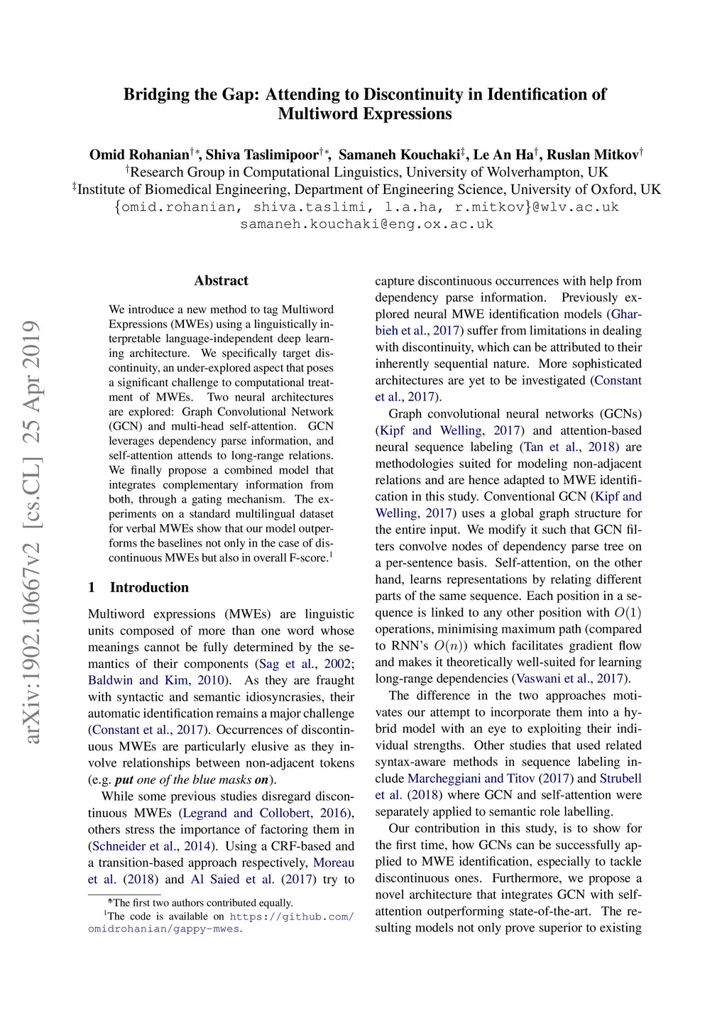 We introduce a new method to tag Multiword Expressions (MWEs) using a linguistically interpretable language-independent deep learning architecture. We specifically target discontinuity, an under-explored aspect that poses a significant challenge to computational treatment of MWEs. Two neural architectures are explored: Graph Convolutional Network (GCN) and multi-head self-attention. GCN leverages dependency parse information, and self-attention attends to long-range relations. We finally propose a combined model that integrates complementary information from both through a gating mechanism. The experiments on a standard multilingual dataset for verbal MWEs show that our model outperforms the baselines not only in the case of discontinuous MWEs but also in overall F-score.