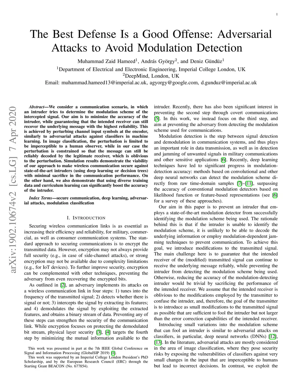 We consider a communication scenario, in which an intruder tries to determine the modulation scheme of the intercepted signal. Our aim is to minimize the accuracy of the intruder, while guaranteeing that the intended receiver can still recover the underlying message with the highest reliability. This is achieved by perturbing channel input symbols at the encoder, similarly to adversarial attacks against classifiers in machine learning. In image classification, the perturbation is limited to be imperceptible to a human observer, while in our case the perturbation is constrained so that the message can still be reliably decoded by the legitimate receiver, which is oblivious to the perturbation. Simulation results demonstrate the viability of our approach to make wireless communication secure against state-of-the-art intruders (using deep learning or decision trees) with minimal sacrifice in the communication performance. On the other hand, we also demonstrate that using diverse training data and curriculum learning can significantly boost the accuracy of the intruder.