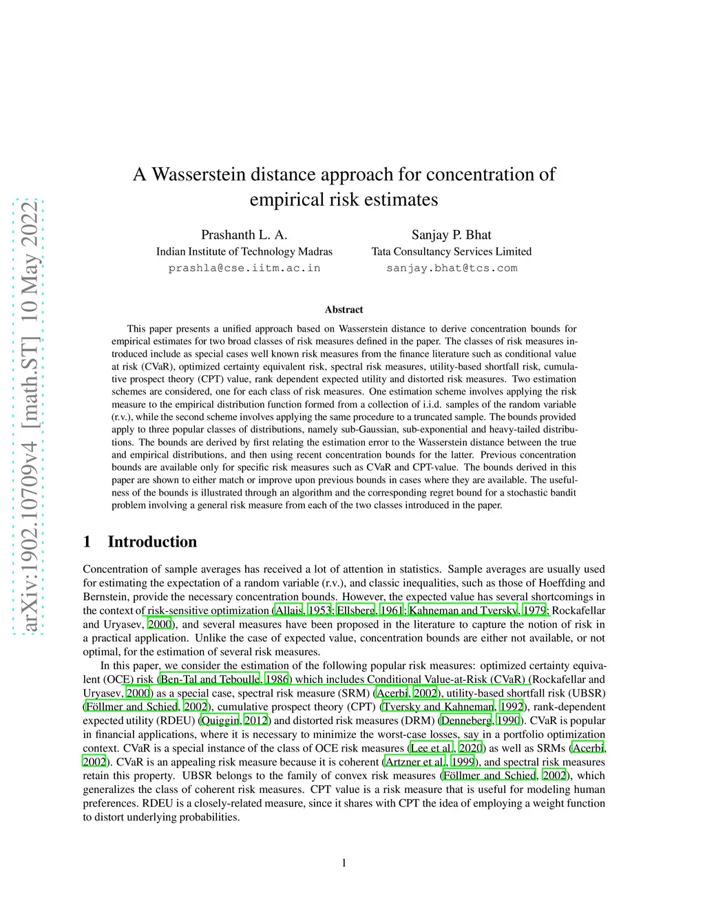 This paper presents a unified approach based on Wasserstein distance to derive concentration bounds for empirical estimates for two broad classes of risk measures defined in the paper. The classes of risk measures introduced include as special cases well known risk measures from the finance literature such as conditional value at risk (CVaR), optimized certainty equivalent risk, spectral risk measures, utility-based shortfall risk, cumulative prospect theory (CPT) value, rank dependent expected utility and distorted risk measures. Two estimation schemes are considered, one for each class of risk measures. One estimation scheme involves applying the risk measure to the empirical distribution function formed from a collection of i.i.d. samples of the random variable (r.v.), while the second scheme involves applying the same procedure to a truncated sample. The bounds provided apply to three popular classes of distributions, namely sub-Gaussian, sub-exponential and heavy-tailed distributions. The bounds are derived by first relating the estimation error to the Wasserstein distance between the true and empirical distributions, and then using recent concentration bounds for the latter. Previous concentration bounds are available only for specific risk measures such as CVaR and CPT-value. The bounds derived in this paper are shown to either match or improve upon previous bounds in cases where they are available. The usefulness of the bounds is illustrated through an algorithm and the corresponding regret bound for a stochastic bandit problem involving a general risk measure from each of the two classes introduced in the paper.