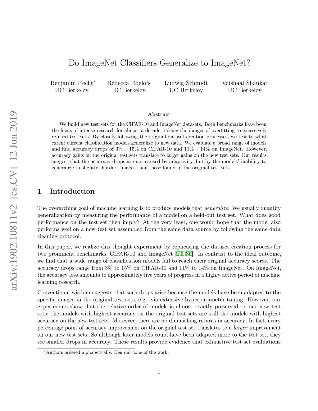 We build new test sets for the CIFAR-10 and ImageNet datasets. Both benchmarks have been the focus of intense research for almost a decade, raising the danger of overfitting to excessively re-used test sets. By closely following the original dataset creation processes, we test to what extent current classification models generalize to new data. We evaluate a broad range of models and find accuracy drops of 3% - 15% on CIFAR-10 and 11% - 14% on ImageNet. However, accuracy gains on the original test sets translate to larger gains on the new test sets. Our results suggest that the accuracy drops are not caused by adaptivity, but by the models' inability to generalize to slightly "harder" images than those found in the original test sets.