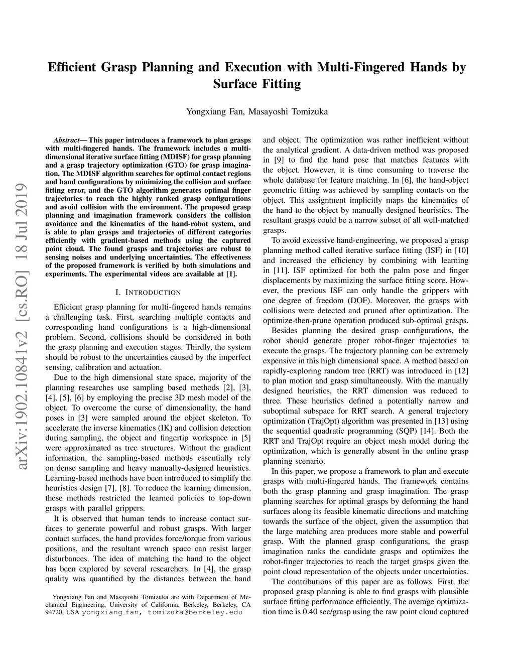 This paper introduces a framework to plan grasps with multi-fingered hands. The framework includes a multi-dimensional iterative surface fitting (MDISF) for grasp planning and a grasp trajectory optimization (GTO) for grasp imagination. The MDISF algorithm searches for optimal contact regions and hand configurations by minimizing the collision and surface fitting error, and the GTO algorithm generates optimal finger trajectories to reach the highly ranked grasp configurations and avoid collision with the environment. The proposed grasp planning and imagination framework considers the collision avoidance and the kinematics of the hand-robot system, and is able to plan grasps and trajectories of different categories efficiently with gradient-based methods using the captured point cloud. The found grasps and trajectories are robust to sensing noises and underlying uncertainties. The effectiveness of the proposed framework is verified by both simulations and experiments.