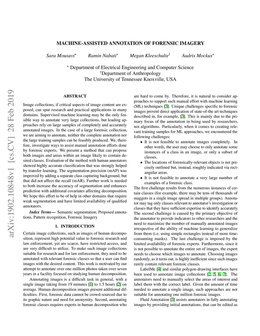 Image collections, if critical aspects of image content are exposed, can spur research and practical applications in many domains. Supervised machine learning may be the only feasible way to annotate very large collections, but leading approaches rely on large samples of completely and accurately annotated images. In the case of a large forensic collection, we are aiming to annotate, neither the complete annotation nor the large training samples can be feasibly produced. We, therefore, investigate ways to assist manual annotation efforts done by forensic experts. We present a method that can propose both images and areas within an image likely to contain desired classes. Evaluation of the method with human annotators showed highly accurate classification that was strongly helped by transfer learning. The segmentation precision (mAP) was improved by adding a separate class capturing background, but that did not affect the recall (mAR). Further work is needed to both increase the accuracy of segmentation and enhances prediction with additional covariates affecting decomposition. We hope this effort to be of help in other domains that require weak segmentation and have limited availability of qualified annotators.