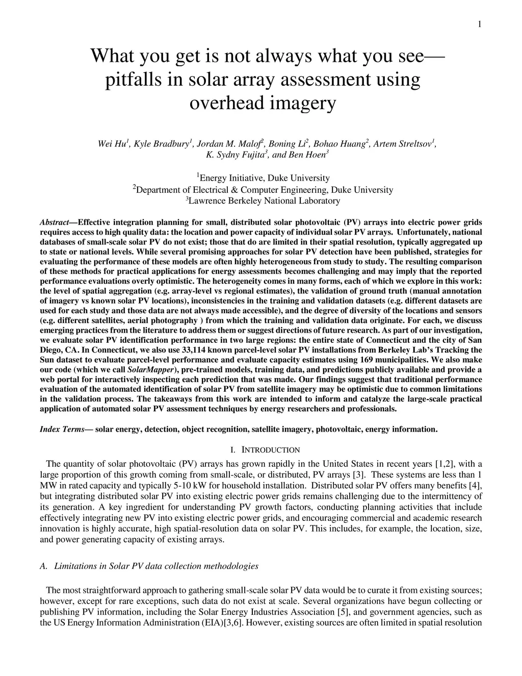 Effective integration planning for small, distributed solar photovoltaic (PV) arrays into electric power grids requires access to high quality data: the location and power capacity of individual solar PV arrays. Unfortunately, national databases of small-scale solar PV do not exist; those that do are limited in their spatial resolution, typically aggregated up to state or national levels. While several promising approaches for solar PV detection have been published, strategies for evaluating the performance of these models are often highly heterogeneous from study to study. The resulting comparison of these methods for practical applications for energy assessments becomes challenging and may imply that the reported performance evaluations are overly optimistic. The heterogeneity comes in many forms, each of which we explore in this work: the level of spatial aggregation, the validation of ground truth, inconsistencies in the training and validation datasets, and the degree of diversity of the locations and sensors from which the training and validation data originate. For each, we discuss emerging practices from the literature to address them or suggest directions of future research. As part of our investigation, we evaluate solar PV identification performance in two large regions. Our findings suggest that traditional performance evaluation of the automated identification of solar PV from satellite imagery may be optimistic due to common limitations in the validation process. The takeaways from this work are intended to inform and catalyze the large-scale practical application of automated solar PV assessment techniques by energy researchers and professionals.