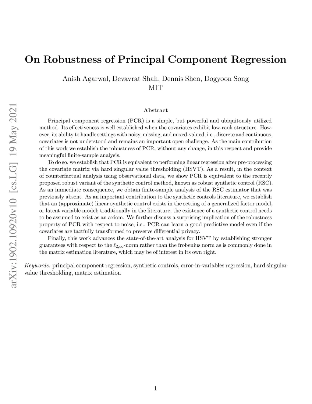 Principal component regression (PCR) is a simple, but powerful and ubiquitously utilized method. Its effectiveness is well established when the covariates exhibit low-rank structure. However, its ability to handle settings with noisy, missing, and mixed-valued, i.e., discrete and continuous, covariates is not understood and remains an important open challenge. As the main contribution of this work we establish the robustness of PCR, without any change, in this respect and provide meaningful finite-sample analysis. To do so, we establish that PCR is equivalent to performing linear regression after pre-processing the covariate matrix via hard singular value thresholding (HSVT). As a result, in the context of counterfactual analysis using observational data, we show PCR is equivalent to the recently proposed robust variant of the synthetic control method, known as robust synthetic control (RSC). As an immediate consequence, we obtain finite-sample analysis of the RSC estimator that was previously absent. As an important contribution to the synthetic controls literature, we establish that an (approximate) linear synthetic control exists in the setting of a generalized factor model or latent variable model; traditionally in the literature, the existence of a synthetic control needs to be assumed to exist as an axiom. We further discuss a surprising implication of the robustness property of PCR with respect to noise, i.e., PCR can learn a good predictive model even if the covariates are tactfully transformed to preserve differential privacy. Finally, this work advances the state-of-the-art analysis for HSVT by establishing stronger guarantees with respect to the -norm rather than the Frobenius norm as is commonly done in the matrix estimation literature, which may be of interest in its own right.