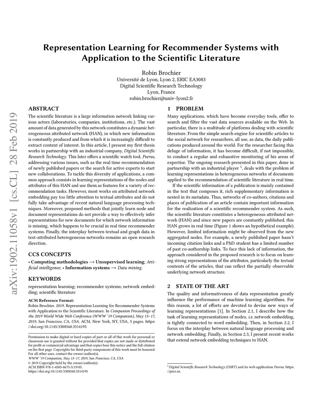 The scientific literature is a large information network linking various actors (laboratories, companies, institutions, etc.). The vast amount of data generated by this network constitutes a dynamic heterogeneous attributed network (HAN), in which new information is constantly produced and from which it is increasingly difficult to extract content of interest. In this article, I present my first thesis works in partnership with an industrial company, Digital Scientific Research Technology. This later offers a scientific watch tool, Peerus, addressing various issues, such as the real time recommendation of newly published papers or the search for active experts to start new collaborations. To tackle this diversity of applications, a common approach consists in learning representations of the nodes and attributes of this HAN and use them as features for a variety of recommendation tasks. However, most works on attributed network embedding pay too little attention to textual attributes and do not fully take advantage of recent natural language processing techniques. Moreover, proposed methods that jointly learn node and document representations do not provide a way to effectively infer representations for new documents for which network information is missing, which happens to be crucial in real time recommender systems. Finally, the interplay between textual and graph data in text-attributed heterogeneous networks remains an open research direction.