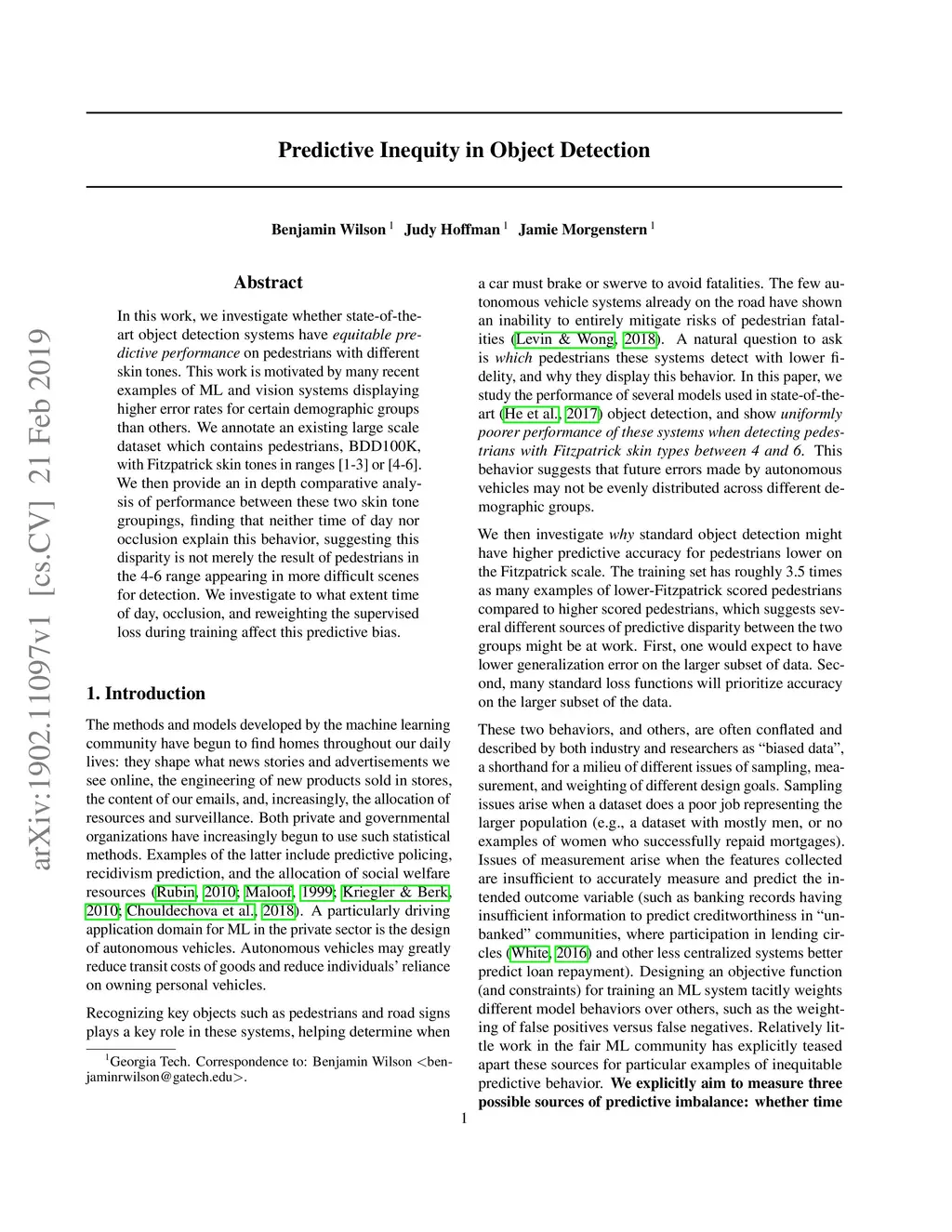 In this work, we investigate whether state-of-the-art object detection systems have equitable predictive performance on pedestrians with different skin tones. This work is motivated by many recent examples of ML and vision systems displaying higher error rates for certain demographic groups than others. We annotate an existing large scale dataset which contains pedestrians, BDD100K, with Fitzpatrick skin tones in ranges [1-3] or [4-6]. We then provide an in-depth comparative analysis of performance between these two skin tone groupings, finding that neither time of day nor occlusion explain this behavior, suggesting this disparity is not merely the result of pedestrians in the 4-6 range appearing in more difficult scenes for detection. We investigate to what extent time of day, occlusion, and reweighting the supervised loss during training affect this predictive bias.