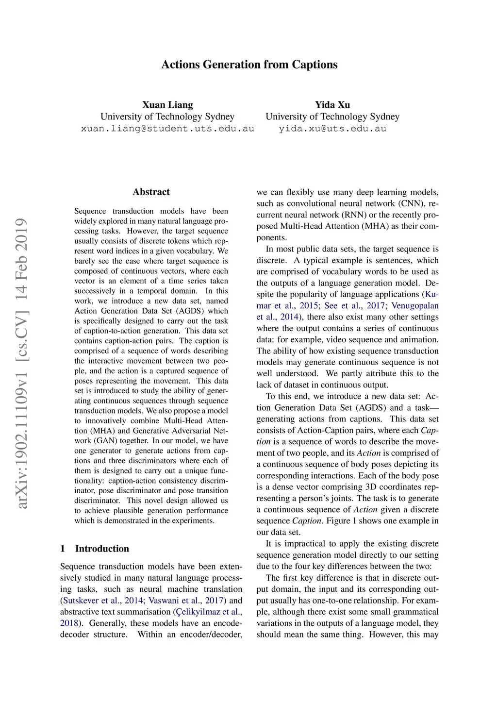 Sequence transduction models have been widely explored in many natural language processing tasks. However, the target sequence usually consists of discrete tokens which represent word indices in a given vocabulary. We barely see the case where target sequence is composed of continuous vectors, where each vector is an element of a time series taken successively in a temporal domain. In this work, we introduce a new data set, named Action Generation Data Set (AGDS) which is specifically designed to carry out the task of caption-to-action generation. This data set contains caption-action pairs. The caption is comprised of a sequence of words describing the interactive movement between two people, and the action is a captured sequence of poses representing the movement. This data set is introduced to study the ability of generating continuous sequences through sequence transduction models. We also propose a model to innovatively combine Multi-Head Attention (MHA) and Generative Adversarial Network (GAN) together. In our model, we have one generator to generate actions from captions and three discriminators where each of them is designed to carry out a unique functionality: caption-action consistency discriminator, pose discriminator and pose transition discriminator. This novel design allowed us to achieve plausible generation performance which is demonstrated in the experiments.