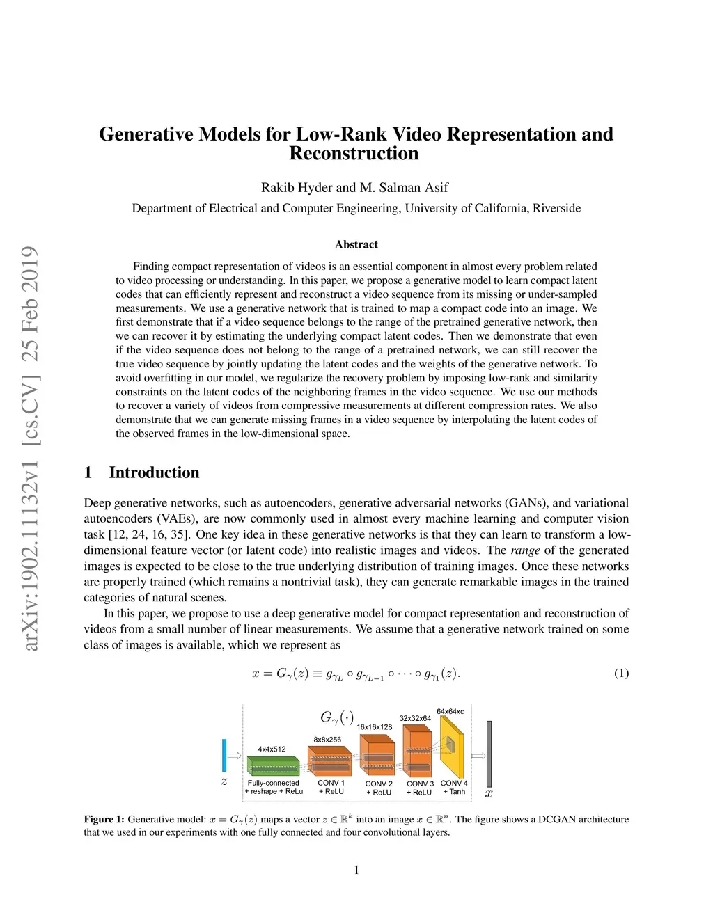 Generative Models for Low-Rank Video Representation and Reconstruction