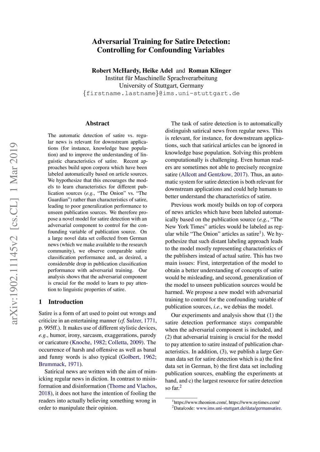 Adversarial Training for Satire Detection: Controlling for Confounding