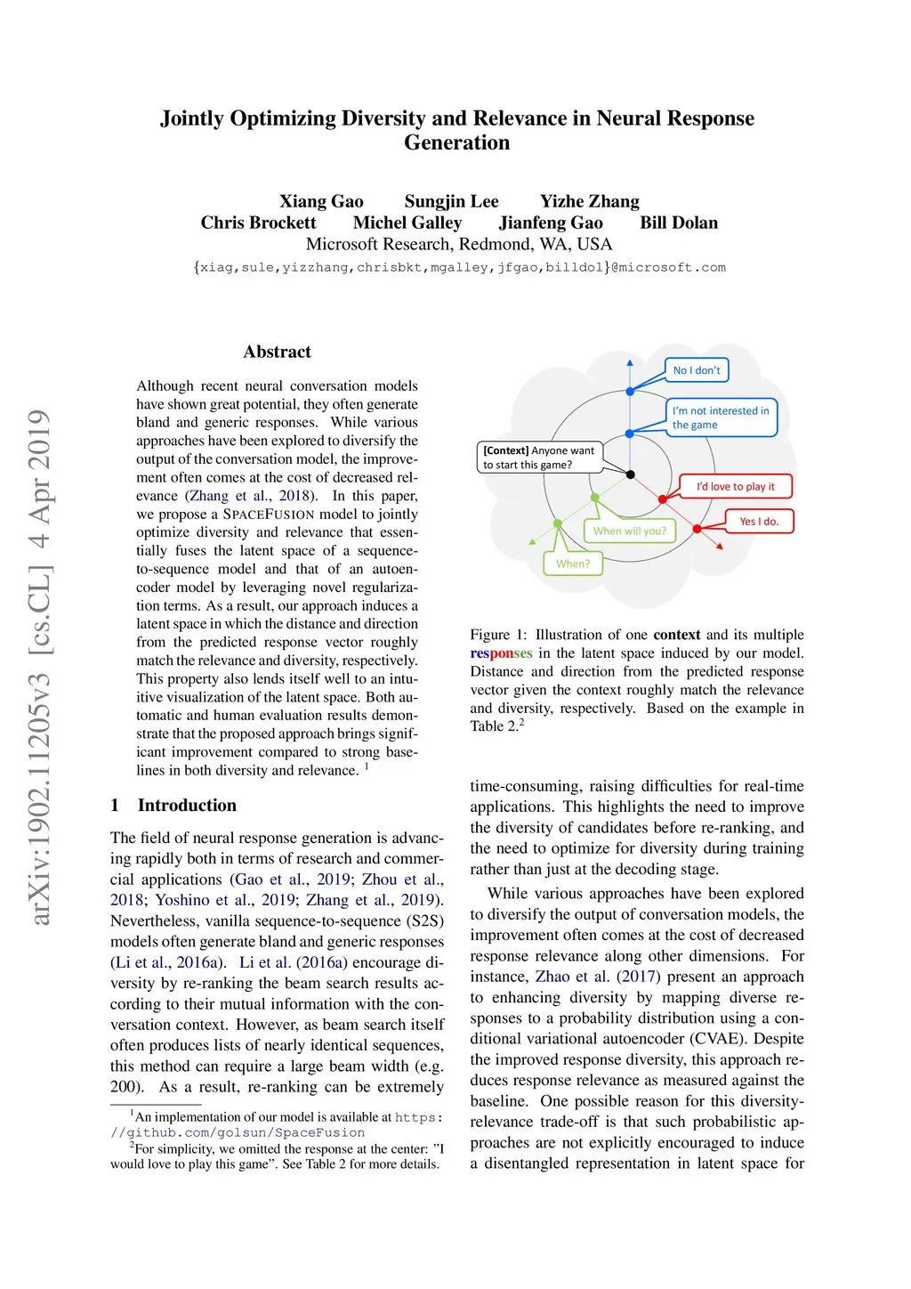 Although recent neural conversation models have shown great potential, they often generate bland and generic responses. While various approaches have been explored to diversify the output of the conversation model, the improvement often comes at the cost of decreased relevance. In this paper, we propose a SpaceFusion model to jointly optimize diversity and relevance that essentially fuses the latent space of a sequence-to-sequence model and that of an autoencoder model by leveraging novel regularization terms. As a result, our approach induces a latent space in which the distance and direction from the predicted response vector roughly match the relevance and diversity, respectively. This property also lends itself well to an intuitive visualization of the latent space. Both automatic and human evaluation results demonstrate that the proposed approach brings significant improvement compared to strong baselines in both diversity and relevance.