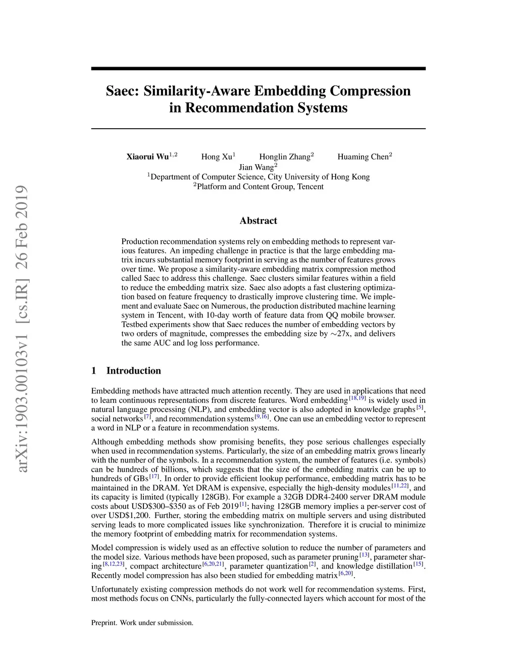 Production recommendation systems rely on embedding methods to represent various features. An impeding challenge in practice is that the large embedding matrix incurs substantial memory footprint in serving as the number of features grows over time. We propose a similarity-aware embedding matrix compression method called Saec to address this challenge. Saec clusters similar features within a field to reduce the embedding matrix size. Saec also adopts a fast clustering optimization based on feature frequency to drastically improve clustering time. We implement and evaluate Saec on Numerous, the production distributed machine learning system in Tencent, with 10-day worth of feature data from QQ mobile browser. Testbed experiments show that Saec reduces the number of embedding vectors by two orders of magnitude, compresses the embedding size by ~27x, and delivers the same AUC and log loss performance.