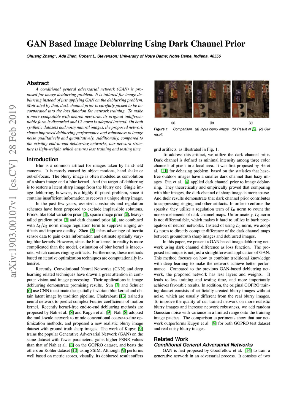 A conditional general adversarial network (GAN) is proposed for image deblurring problem. It is tailored for image deblurring instead of just applying GAN on the deblurring problem. Motivated by that, dark channel prior is carefully picked to be incorporated into the loss function for network training. To make it more compatible with neuron networks, its original indifferentiable form is discarded and L2 norm is adopted instead. On both synthetic datasets and noisy natural images, the proposed network shows improved deblurring performance and robustness to image noise qualitatively and quantitatively. Additionally, compared to the existing end-to-end deblurring networks, our network structure is light-weight, which ensures less training and testing time.