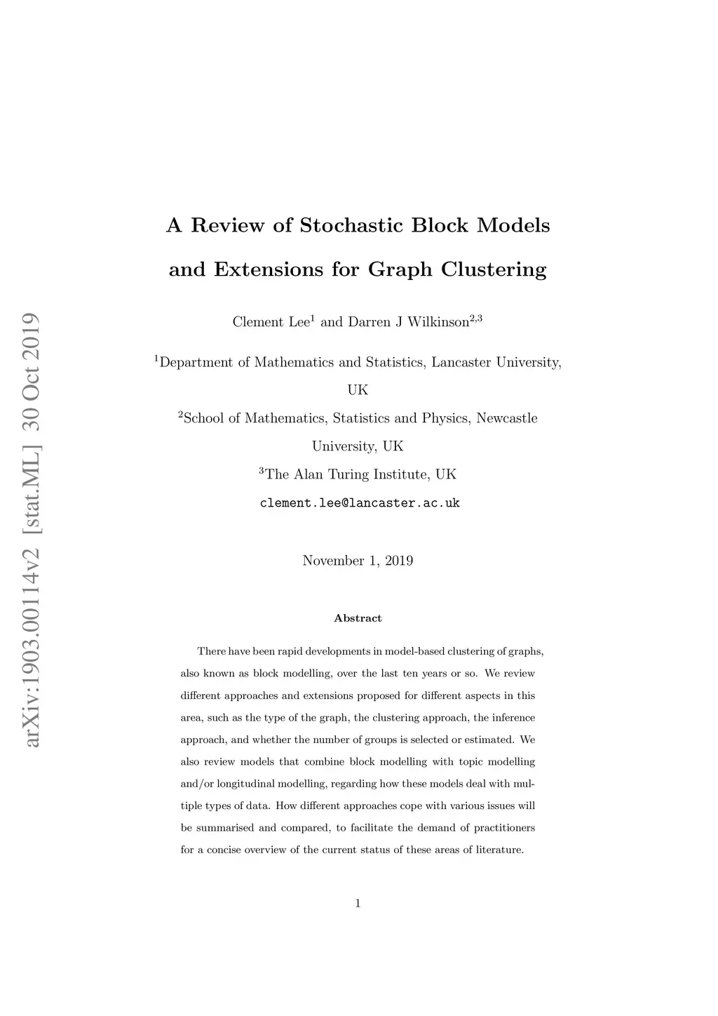 There have been rapid developments in model-based clustering of graphs, also known as block modelling, over the last ten years or so. We review different approaches and extensions proposed for different aspects in this area, such as the type of the graph, the clustering approach, the inference approach, and whether the number of groups is selected or estimated. We also review models that combine block modelling with topic modelling and/or longitudinal modelling, regarding how these models deal with multiple types of data. How different approaches cope with various issues will be summarised and compared, to facilitate the demand of practitioners for a concise overview of the current status of these areas of literature.