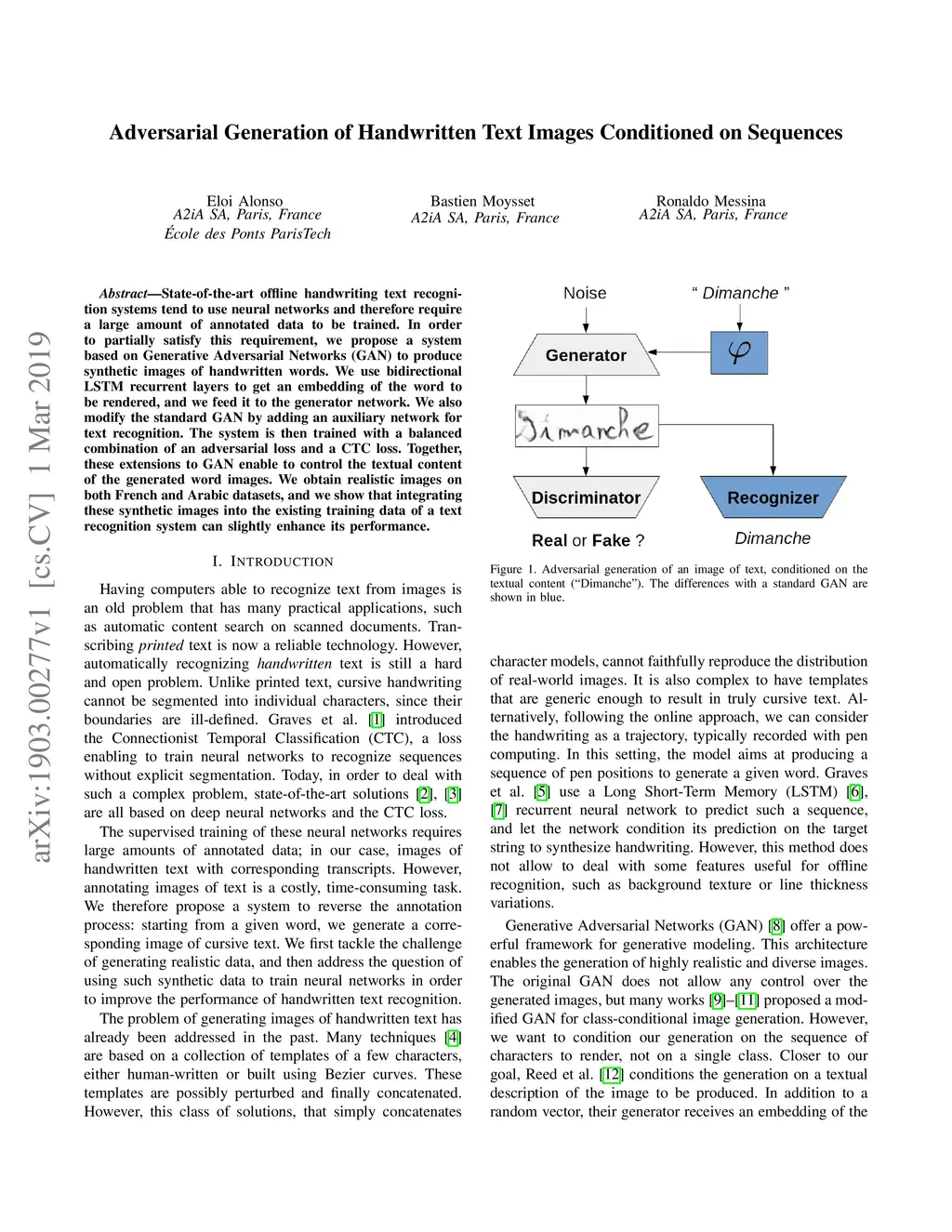 State-of-the-art offline handwriting text recognition systems tend to use neural networks and therefore require a large amount of annotated data to be trained. In order to partially satisfy this requirement, we propose a system based on Generative Adversarial Networks (GAN) to produce synthetic images of handwritten words. We use bidirectional LSTM recurrent layers to get an embedding of the word to be rendered, and we feed it to the generator network. We also modify the standard GAN by adding an auxiliary network for text recognition. The system is then trained with a balanced combination of an adversarial loss and a CTC loss. Together, these extensions to GAN enable to control the textual content of the generated word images. We obtain realistic images on both French and Arabic datasets, and we show that integrating these synthetic images into the existing training data of a text recognition system can slightly enhance its performance.