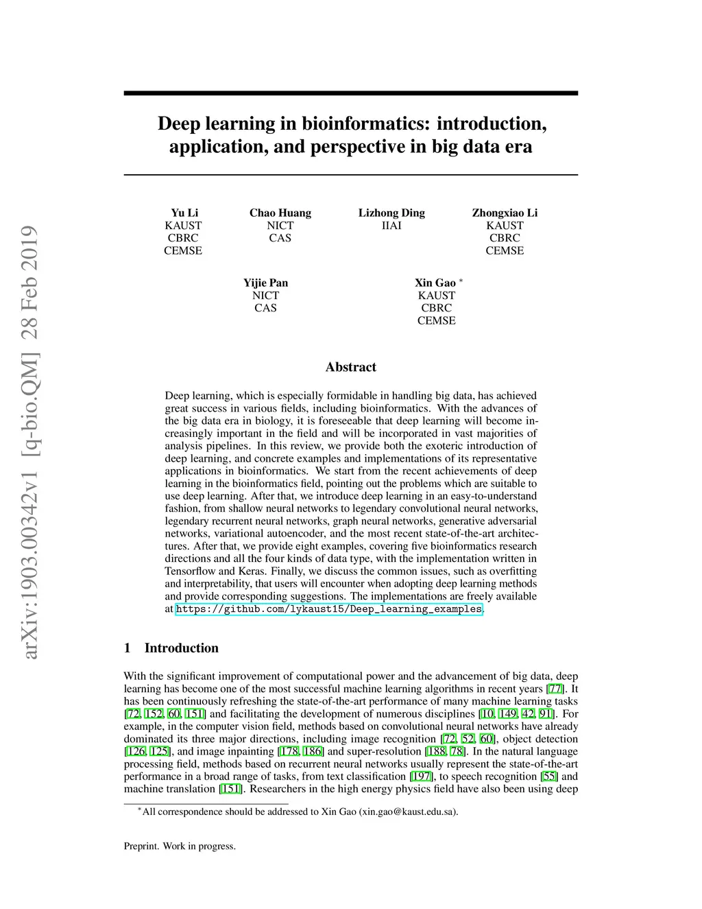 Deep learning, which is especially formidable in handling big data, has achieved great success in various fields, including bioinformatics. With the advances of the big data era in biology, it is foreseeable that deep learning will become increasingly important in the field and will be incorporated in vast majorities of analysis pipelines. In this review, we provide both the exoteric introduction of deep learning, and concrete examples and implementations of its representative applications in bioinformatics. We start from the recent achievements of deep learning in the bioinformatics field, pointing out the problems which are suitable to use deep learning. After that, we introduce deep learning in an easy-to-understand fashion, from shallow neural networks to legendary convolutional neural networks, legendary recurrent neural networks, graph neural networks, generative adversarial networks, variational autoencoder, and the most recent state-of-the-art architectures. After that, we provide eight examples, covering five bioinformatics research directions and all the four kinds of data type, with the implementation written in Tensorflow and Keras. Finally, we discuss the common issues, such as overfitting and interpretability, that users will encounter when adopting deep learning methods and provide corresponding suggestions. The implementations are freely available at \url{https://github.com/lykaust15/Deep_learning_examples}.