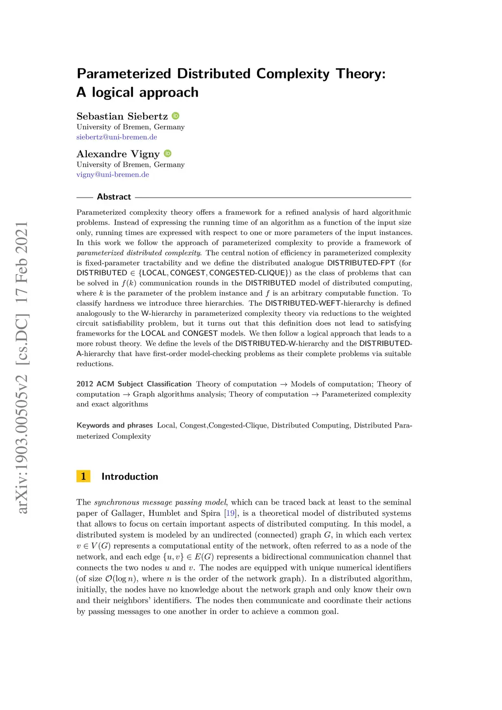 Parameterized complexity theory offers a framework for a refined analysis of hard algorithmic problems. Instead of expressing the running time of an algorithm as a function of the input size only, running times are expressed with respect to one or more parameters of the input instances. In this work we follow the approach of parameterized complexity to provide a framework of parameterized distributed complexity. The central notion of efficiency in parameterized complexity is fixed-parameter tractability and we define the distributed analogue Distributed-FPT (for Distributed in ) as the class of problems that can be solved in communication rounds in the Distributed model of distributed computing, where is the parameter of the problem instance and is an arbitrary computable function. To classify hardness we introduce three hierarchies. The Distributed-WEFT-hierarchy is defined analogously to the W-hierarchy in parameterized complexity theory via reductions to the weighted circuit satisfiability problem, but it turns out that this definition does not lead to satisfying frameworks for the Local and Congest models. We then follow a logical approach that leads to a more robust theory. We define the levels of the Distributed-W-hierarchy and the Distributed-A-hierarchy that have first-order model-checking problems as their complete problems via suitable reductions.