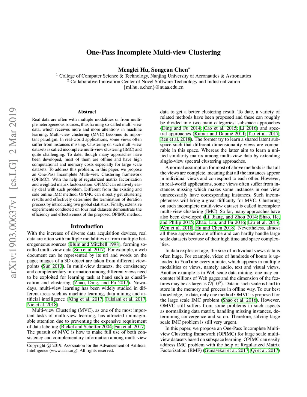 Real data are often with multiple modalities or from multiple heterogeneous sources, thus forming so-called multi-view data, which receives more and more attentions in machine learning. Multi-view clustering (MVC) becomes its important paradigm. In real-world applications, some views often suffer from instances missing. Clustering on such multi-view datasets is called incomplete multi-view clustering (IMC) and quite challenging. To date, though many approaches have been developed, most of them are offline and have high computational and memory costs especially for large scale datasets. To address this problem, in this paper, we propose an One-Pass Incomplete Multi-view Clustering framework (OPIMC). With the help of regularized matrix factorization and weighted matrix factorization, OPIMC can relatively easily deal with such problem. Different from the existing and sole online IMC method, OPIMC can directly get clustering results and effectively determine the termination of iteration process by introducing two global statistics. Finally, extensive experiments conducted on four real datasets demonstrate the efficiency and effectiveness of the proposed OPIMC method.