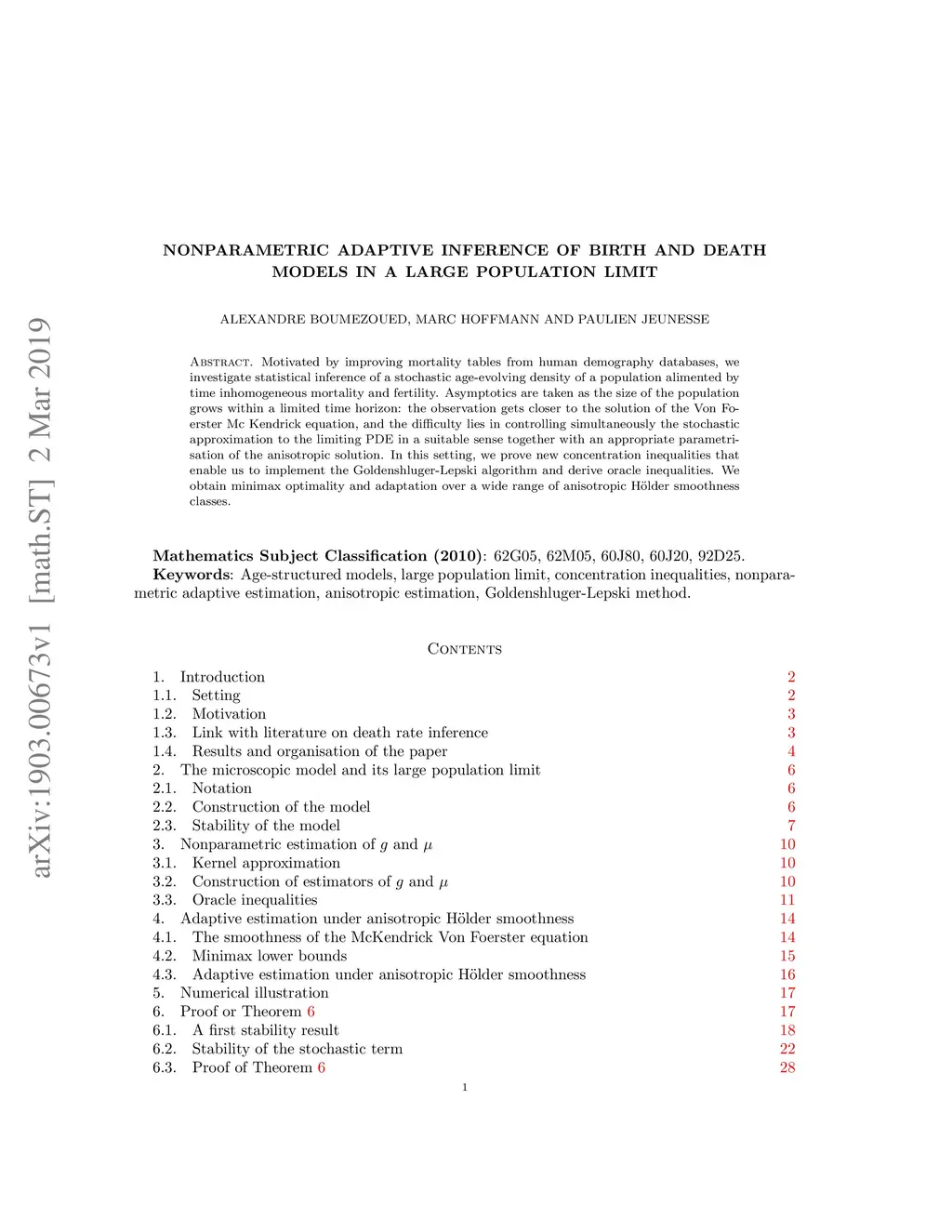Motivated by improving mortality tables from human demography databases, we investigate statistical inference of a stochastic age-evolving density of a population alimented by time inhomogeneous mortality and fertility. Asymptotics are taken as the size of the population grows within a limited time horizon: the observation gets closer to the solution of the Von Foerster Mc Kendrick equation, and the difficulty lies in controlling simultaneously the stochastic approximation to the limiting PDE in a suitable sense together with an appropriate parametrisation of the anisotropic solution. In this setting, we prove new concentration inequalities that enable us to implement the Goldenshluger-Lepski algorithm and derive oracle inequalities. We obtain minimax optimality and adaptation over a wide range of anisotropic H\"older smoothness classes.