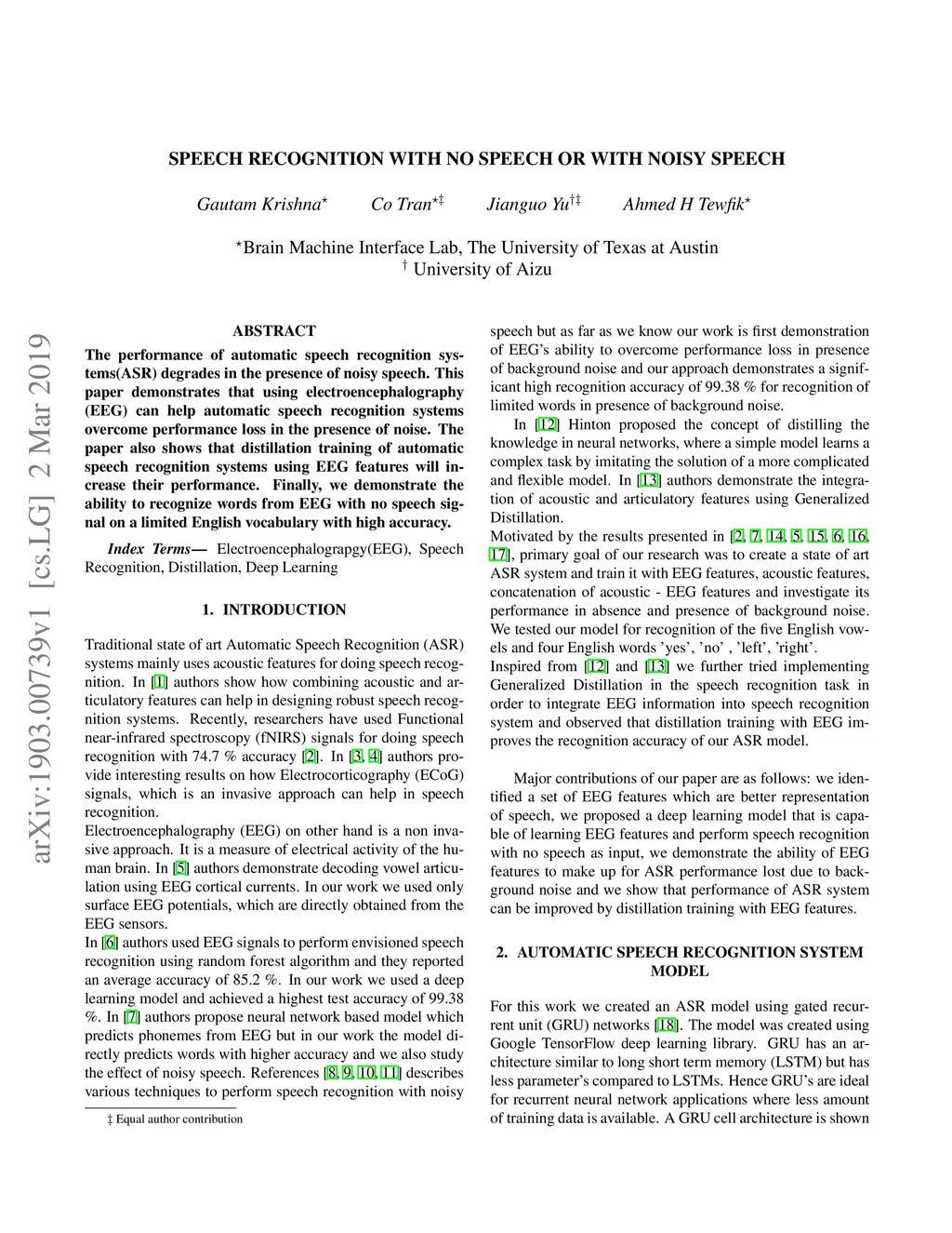 The performance of automatic speech recognition systems(ASR) degrades in the presence of noisy speech. This paper demonstrates that using electroencephalography (EEG) can help automatic speech recognition systems overcome performance loss in the presence of noise. The paper also shows that distillation training of automatic speech recognition systems using EEG features will increase their performance. Finally, we demonstrate the ability to recognize words from EEG with no speech signal on a limited English vocabulary with high accuracy.