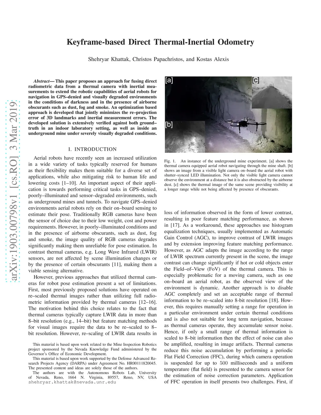 This paper proposes an approach for fusing direct radiometric data from a thermal camera with inertial measurements to extend the robotic capabilities of aerial robots for navigation in GPS-denied and visually degraded environments in the conditions of darkness and in the presence of airborne obscurants such as dust, fog and smoke. An optimization based approach is developed that jointly minimizes the re-projection error of 3D landmarks and inertial measurement errors. The developed solution is extensively verified against both ground-truth in an indoor laboratory setting, as well as inside an underground mine under severely visually degraded conditions.