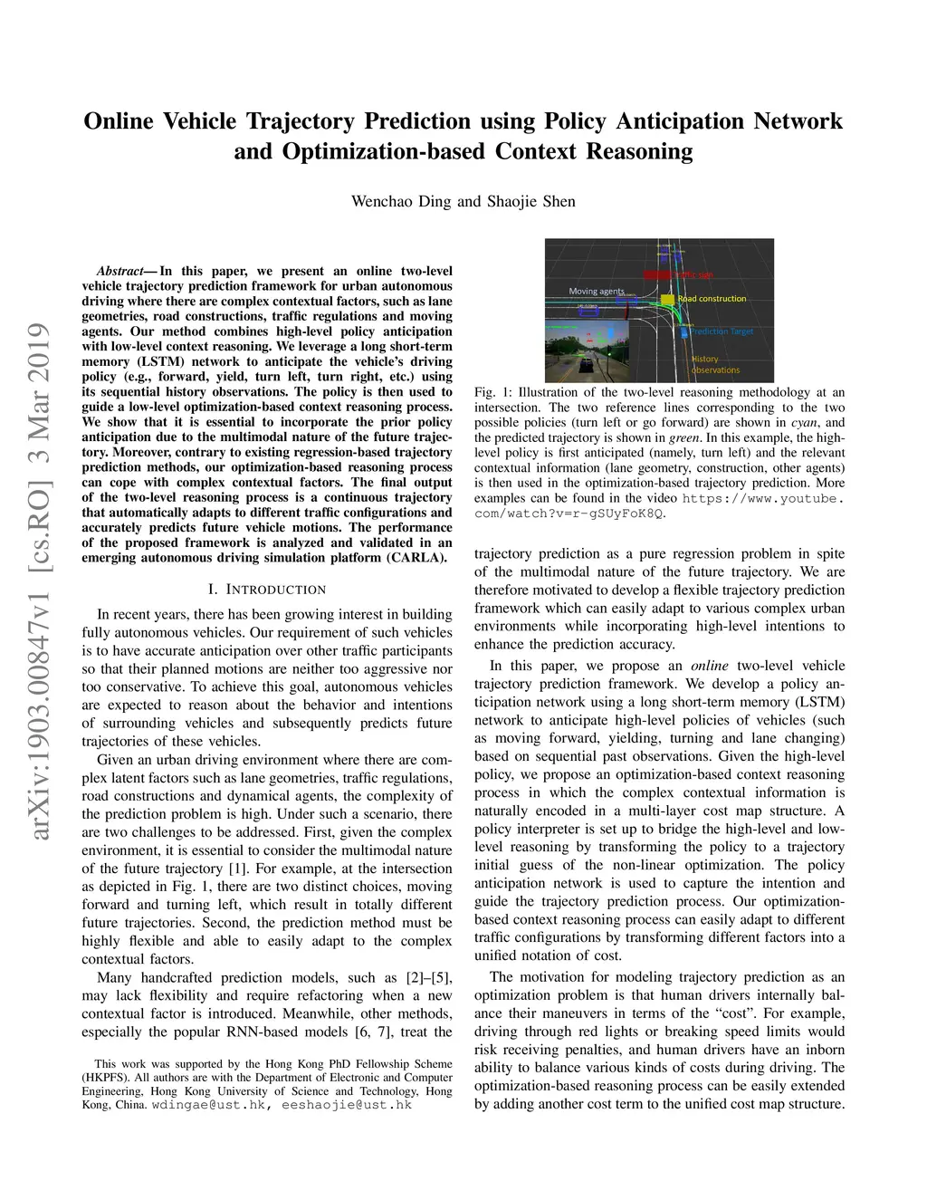 In this paper, we present an online two-level vehicle trajectory prediction framework for urban autonomous driving where there are complex contextual factors, such as lane geometries, road constructions, traffic regulations and moving agents. Our method combines high-level policy anticipation with low-level context reasoning. We leverage a long short-term memory (LSTM) network to anticipate the vehicle's driving policy (e.g., forward, yield, turn left, turn right, etc.) using its sequential history observations. The policy is then used to guide a low-level optimization-based context reasoning process. We show that it is essential to incorporate the prior policy anticipation due to the multimodal nature of the future trajectory. Moreover, contrary to existing regression-based trajectory prediction methods, our optimization-based reasoning process can cope with complex contextual factors. The final output of the two-level reasoning process is a continuous trajectory that automatically adapts to different traffic configurations and accurately predicts future vehicle motions. The performance of the proposed framework is analyzed and validated in an emerging autonomous driving simulation platform (CARLA).
