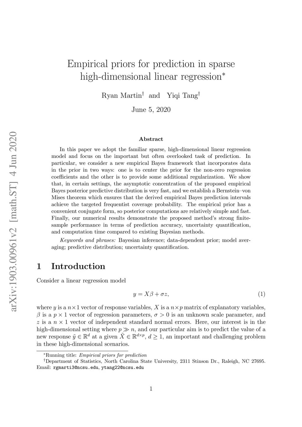 In this paper we adopt the familiar sparse, high-dimensional linear regression model and focus on the important but often overlooked task of prediction. In particular, we consider a new empirical Bayes framework that incorporates data in the prior in two ways: one is to center the prior for the non-zero regression coefficients and the other is to provide some additional regularization. We show that, in certain settings, the asymptotic concentration of the proposed empirical Bayes posterior predictive distribution is very fast, and we establish a Bernstein--von Mises theorem which ensures that the derived empirical Bayes prediction intervals achieve the targeted frequentist coverage probability. The empirical prior has a convenient conjugate form, so posterior computations are relatively simple and fast. Finally, our numerical results demonstrate the proposed method's strong finite-sample performance in terms of prediction accuracy, uncertainty quantification, and computation time compared to existing Bayesian methods.