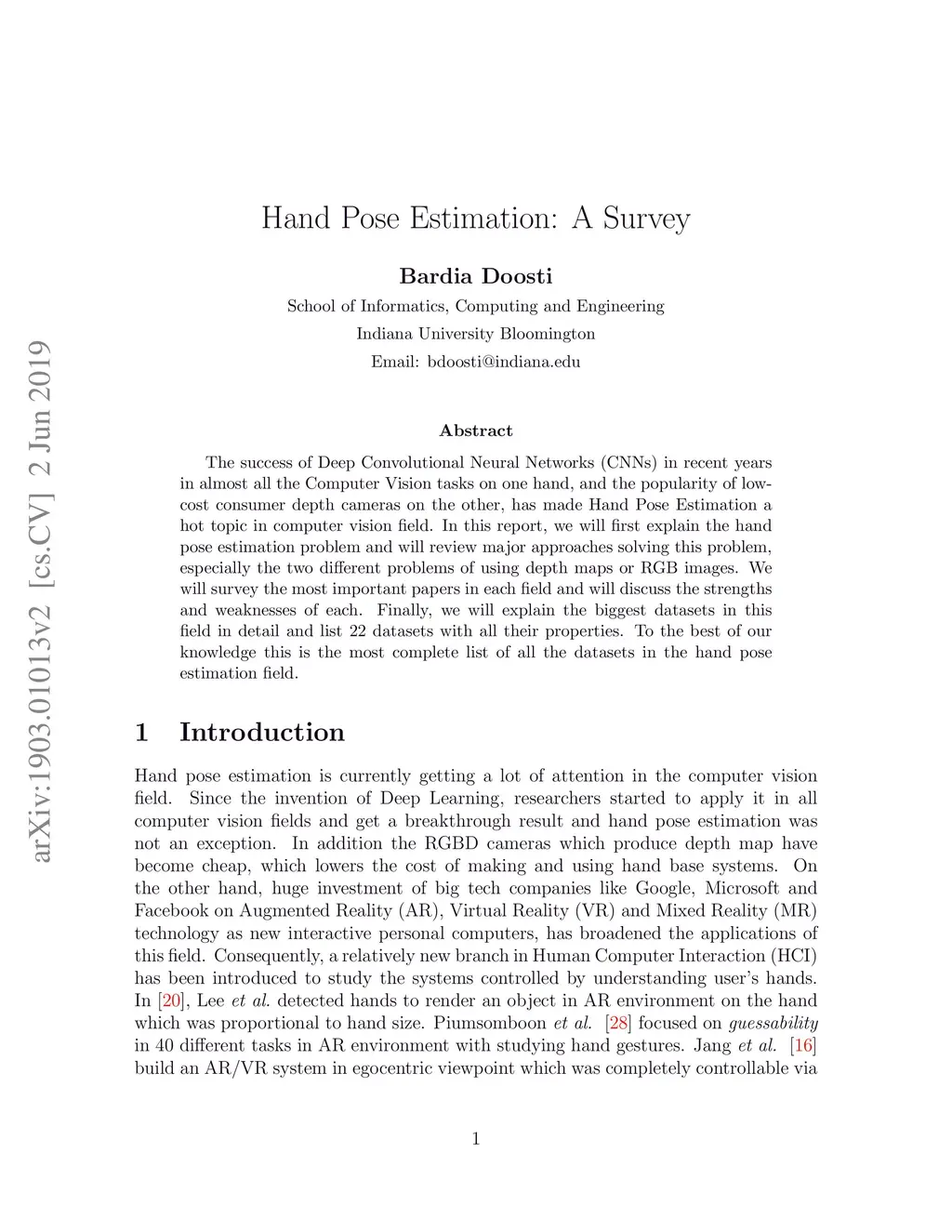 The success of Deep Convolutional Neural Networks (CNNs) in recent years in almost all the Computer Vision tasks on one hand, and the popularity of low-cost consumer depth cameras on the other, has made Hand Pose Estimation a hot topic in computer vision field. In this report, we will first explain the hand pose estimation problem and will review major approaches solving this problem, especially the two different problems of using depth maps or RGB images. We will survey the most important papers in each field and will discuss the strengths and weaknesses of each. Finally, we will explain the biggest datasets in this field in detail and list 22 datasets with all their properties. To the best of our knowledge this is the most complete list of all the datasets in the hand pose estimation field.