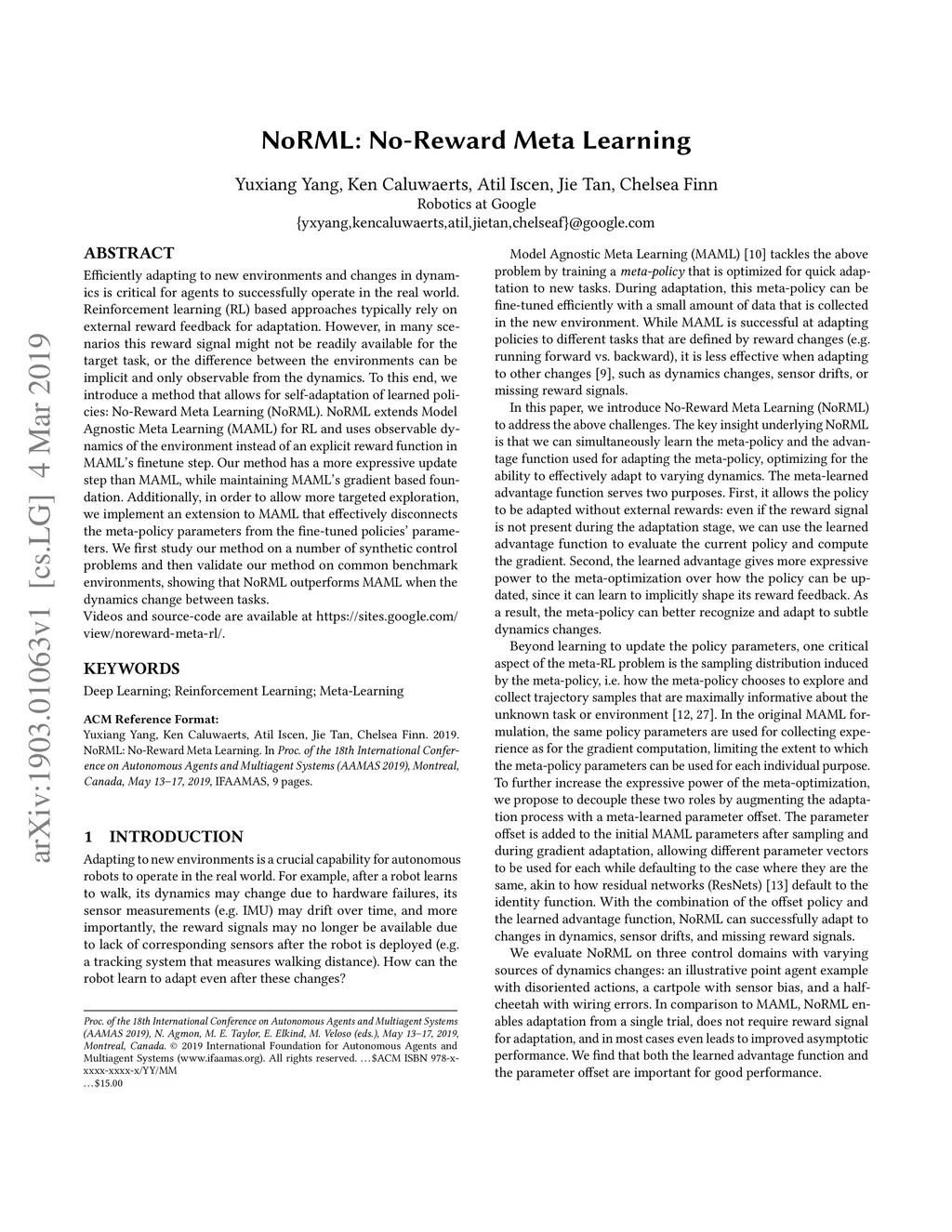 Efficiently adapting to new environments and changes in dynamics is critical for agents to successfully operate in the real world. Reinforcement learning (RL) based approaches typically rely on external reward feedback for adaptation. However, in many scenarios this reward signal might not be readily available for the target task, or the difference between the environments can be implicit and only observable from the dynamics. To this end, we introduce a method that allows for self-adaptation of learned policies: No-Reward Meta Learning (NoRML). NoRML extends Model Agnostic Meta Learning (MAML) for RL and uses observable dynamics of the environment instead of an explicit reward function in MAML's finetune step. Our method has a more expressive update step than MAML, while maintaining MAML's gradient based foundation. Additionally, in order to allow more targeted exploration, we implement an extension to MAML that effectively disconnects the meta-policy parameters from the fine-tuned policies' parameters. We first study our method on a number of synthetic control problems and then validate our method on common benchmark environments, showing that NoRML outperforms MAML when the dynamics change between tasks.