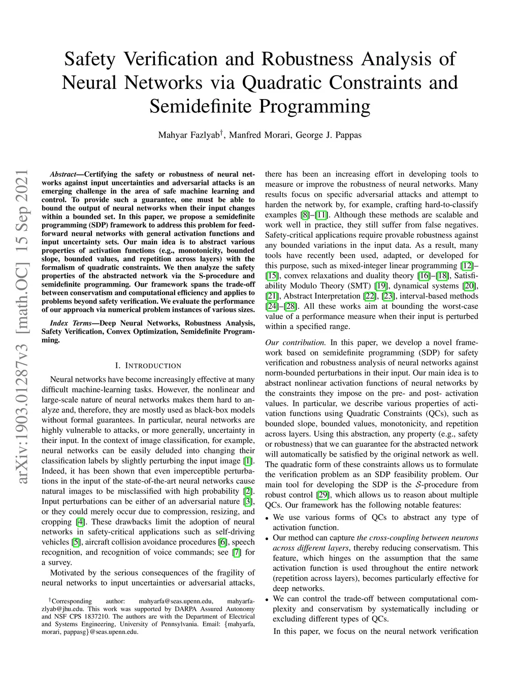 Analyzing the robustness of neural networks against norm-bounded uncertainties and adversarial attacks has found many applications ranging from safety verification to robust training. In this paper, we propose a semidefinite programming (SDP) framework for safety verification and robustness analysis of neural networks with general activation functions. Our main idea is to abstract various properties of activation functions (e.g., monotonicity, bounded slope, bounded values, and repetition across layers) with the formalism of quadratic constraints. We then analyze the safety properties of the abstracted network via the S-procedure and semidefinite programming. Compared to other semidefinite relaxations proposed in the literature, our method is less conservative, especially for deep networks, with an order of magnitude reduction in computational complexity. Furthermore, our approach is applicable to any activation functions.