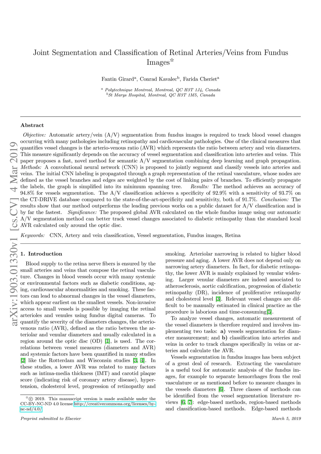 Objective Automatic artery/vein (A/V) segmentation from fundus images is required to track blood vessel changes occurring with many pathologies including retinopathy and cardiovascular pathologies. One of the clinical measures that quantifies vessel changes is the arterio-venous ratio (AVR) which represents the ratio between artery and vein diameters. This measure significantly depends on the accuracy of vessel segmentation and classification into arteries and veins. This paper proposes a fast, novel method for semantic A/V segmentation combining deep learning and graph propagation. Methods A convolutional neural network (CNN) is proposed to jointly segment and classify vessels into arteries and veins. The initial CNN labeling is propagated through a graph representation of the retinal vasculature, whose nodes are defined as the vessel branches and edges are weighted by the cost of linking pairs of branches. To efficiently propagate the labels, the graph is simplified into its minimum spanning tree. Results The method achieves an accuracy of 94.8% for vessels segmentation. The A/V classification achieves a specificity of 92.9% with a sensitivity of 93.7% on the CT-DRIVE database compared to the state-of-the-art-specificity and sensitivity, both of 91.7%. Conclusion The results show that our method outperforms the leading previous works on a public dataset for A/V classification and is by far the fastest. Significance The proposed global AVR calculated on the whole fundus image using our automatic A/V segmentation method can better track vessel changes associated to diabetic retinopathy than the standard local AVR calculated only around the optic disc.